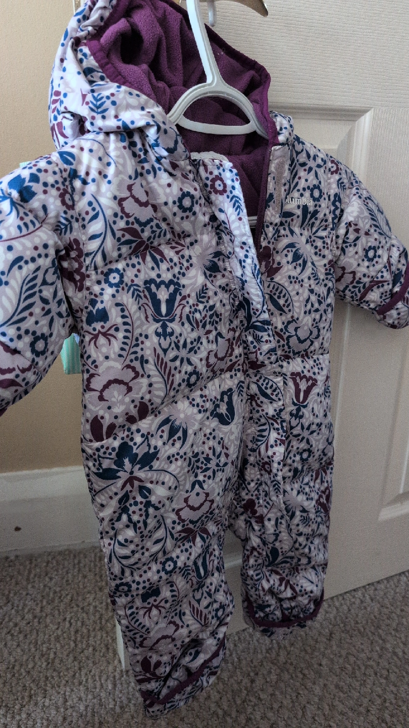 Keep your little one warm with this adorable Columbia fleece snowsuit and down bunting set. Use separately or together. It's a cozy purple colour and perfect for those chilly days. The size is 6-12 months, so it's great for a growing baby. The outer snowsuit has a cute floral pattern!
