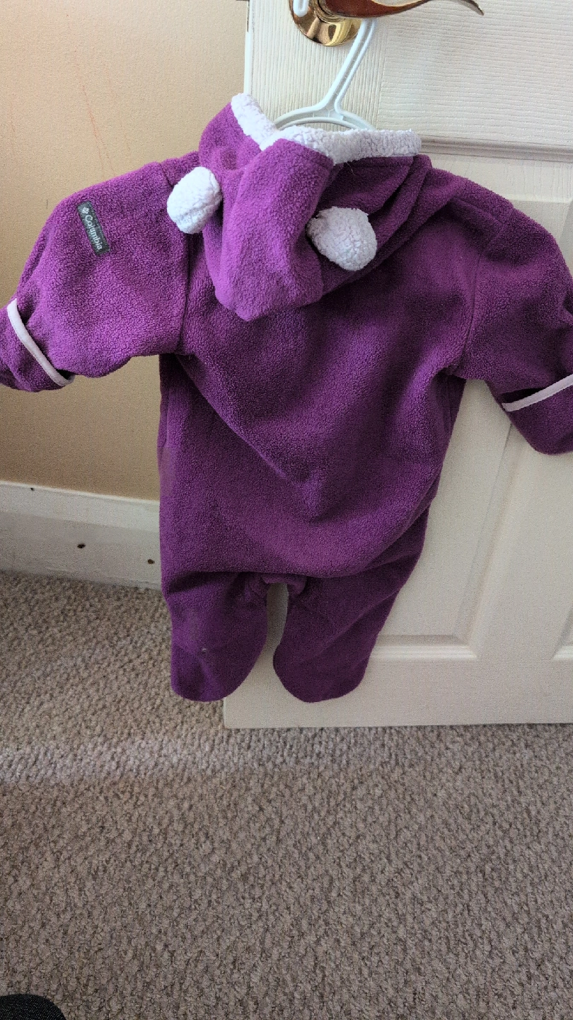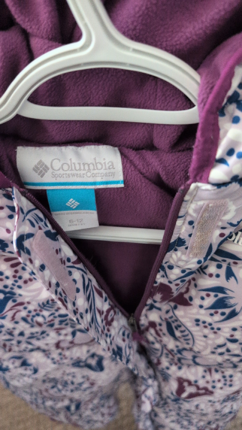 Keep your little one warm with this adorable Columbia fleece snowsuit and down bunting set. Use separately or together. It's a cozy purple colour and perfect for those chilly days. The size is 6-12 months, so it's great for a growing baby. The outer snowsuit has a cute floral pattern!