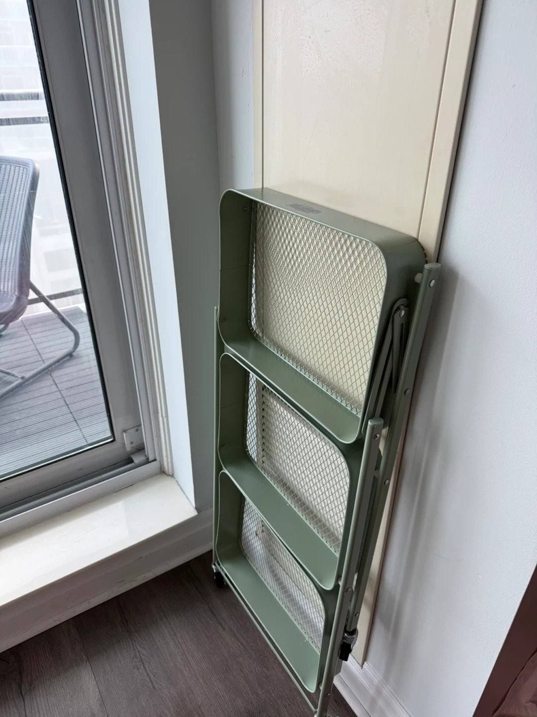 This 3-tier rolling cart comes in a lovely sage green colour. It's made of metal and has a mesh bottom on each shelf. It's super handy for organizing in any room!