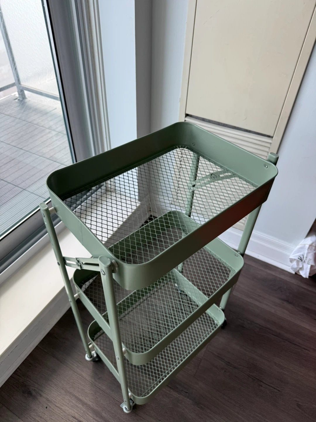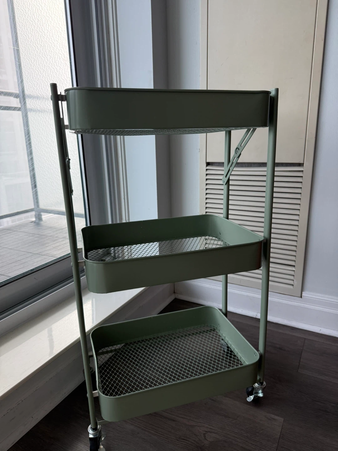 This 3-tier rolling cart comes in a lovely sage green colour. It's made of metal and has a mesh bottom on each shelf. It's super handy for organizing in any room!
