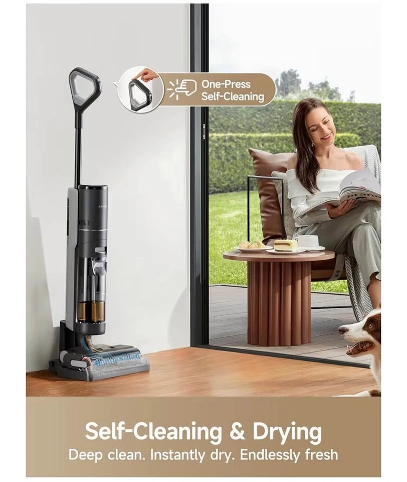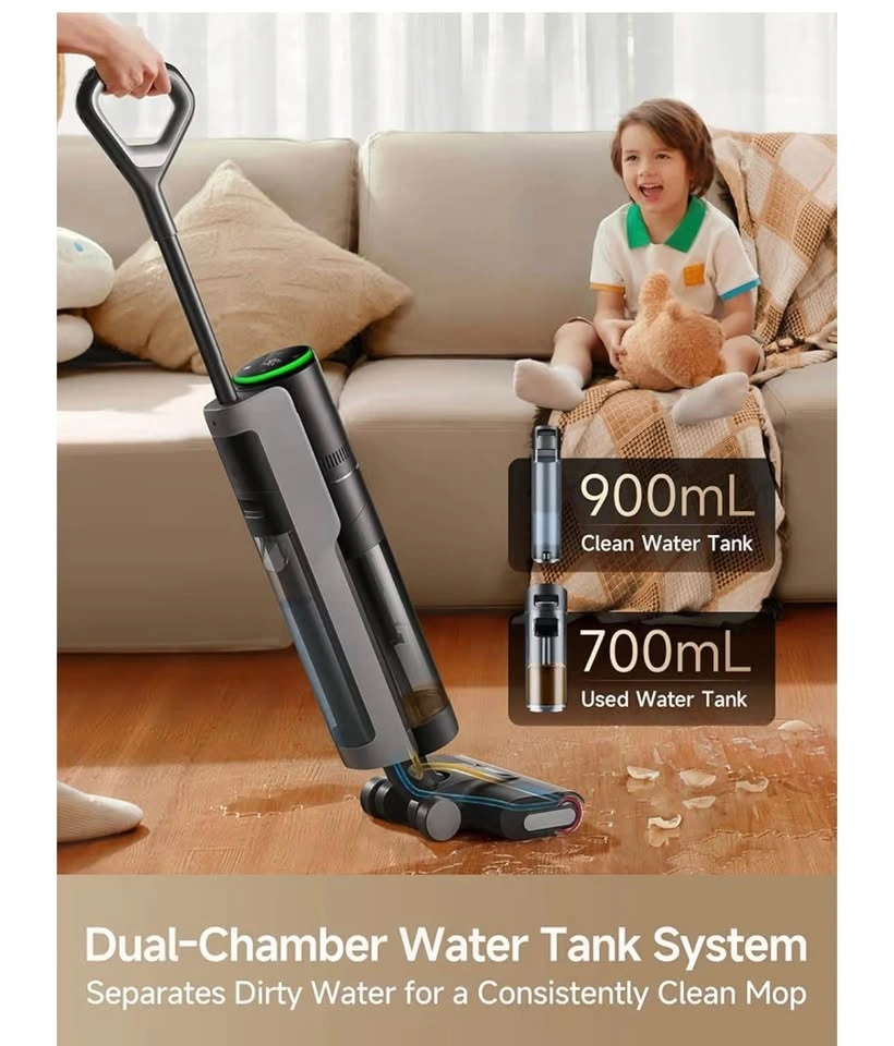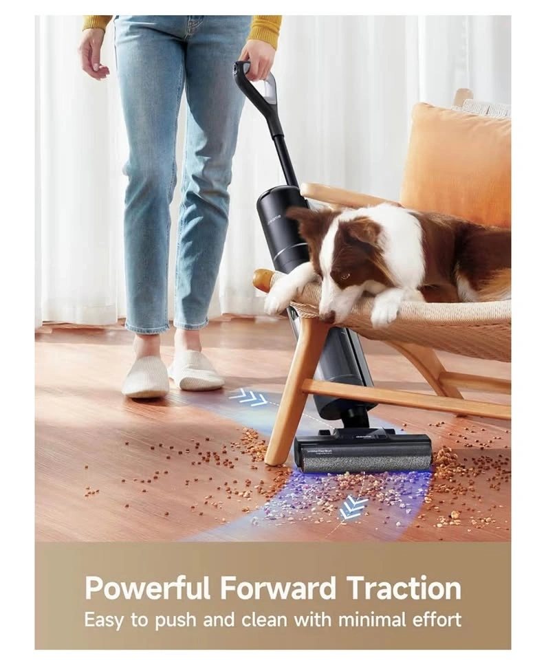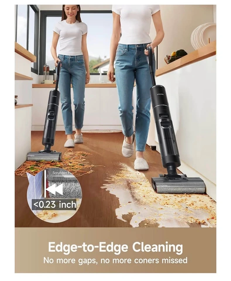 Enjoy up to 35 minutes of cordless cleaning on a single charge. The large tank cleans up to 2,200 sq ft, covering whole-home cleaning with fewer interruptions. This 2-in-1 vacuum and mop picks up dry debris and wet spills simultaneously. Floors stay gleaming and barefoot-friendly. It deep-cleans hard floors and every corner with up to 16kPa suction power. The brush roller self-cleans and dries with hot air to prevent mildew and odors. It automatically detects dirt type and adjusts suction and water flow.