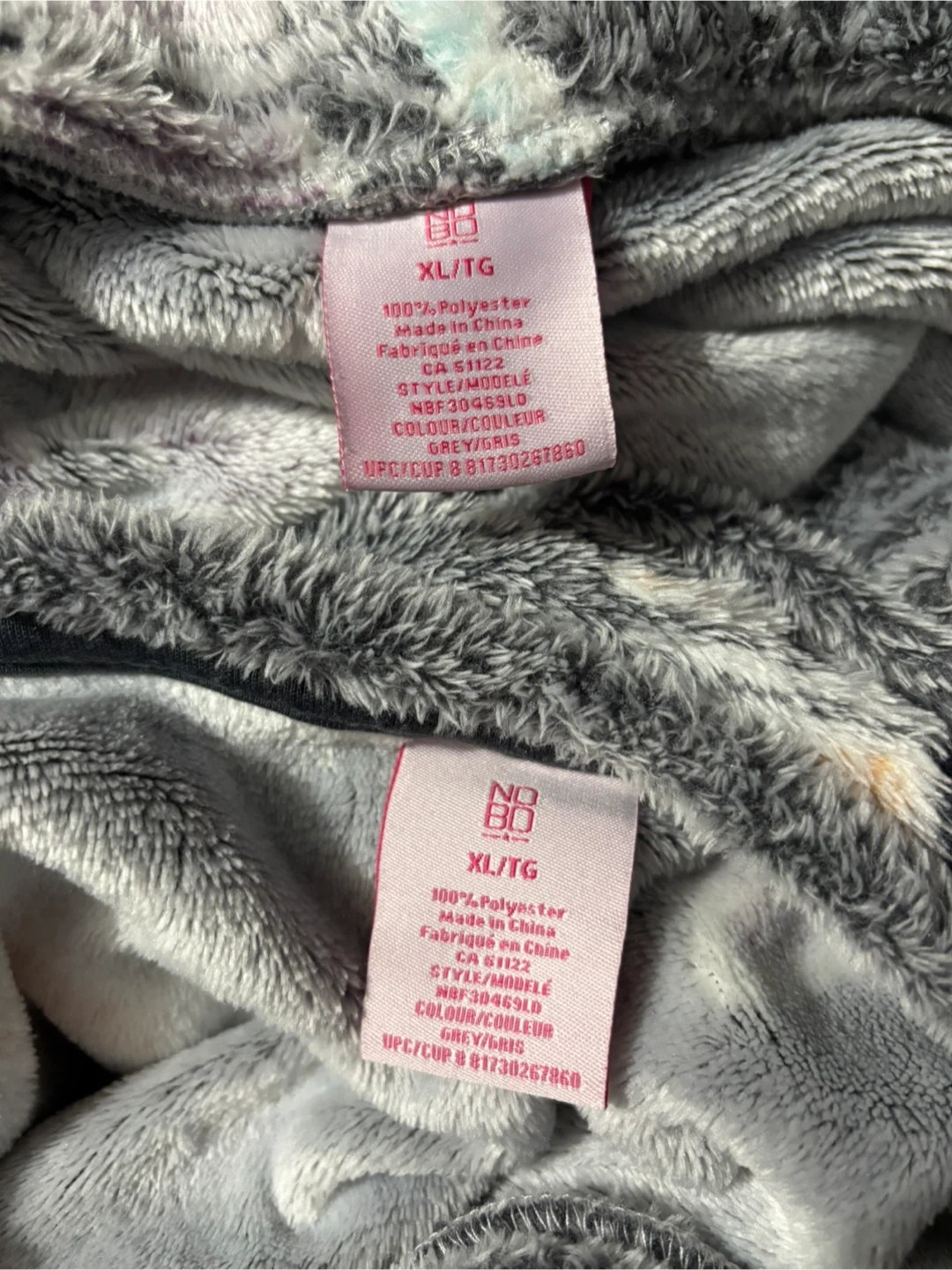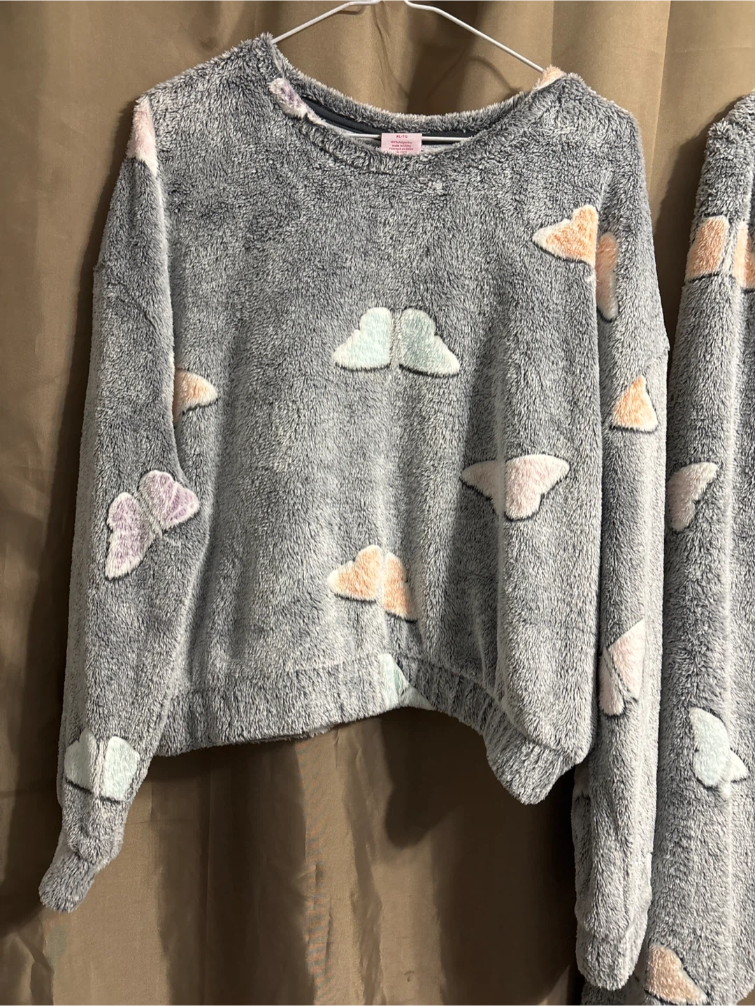 This is a cozy fluffy pajama set from NO BOUNDARIES. It includes a long-sleeved top and matching pants. Both pieces are made of 100% polyester and feature a grey base with colourful butterfly and cloud appliques. They're size XL/TG.