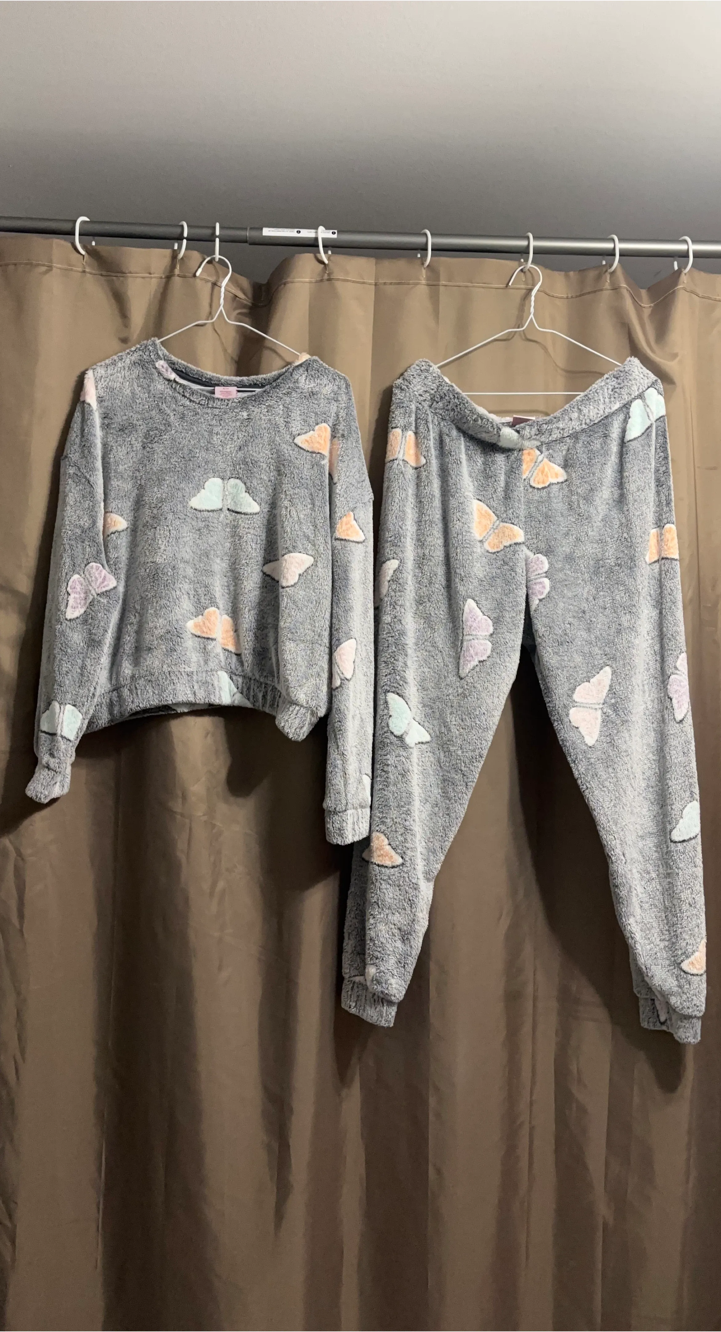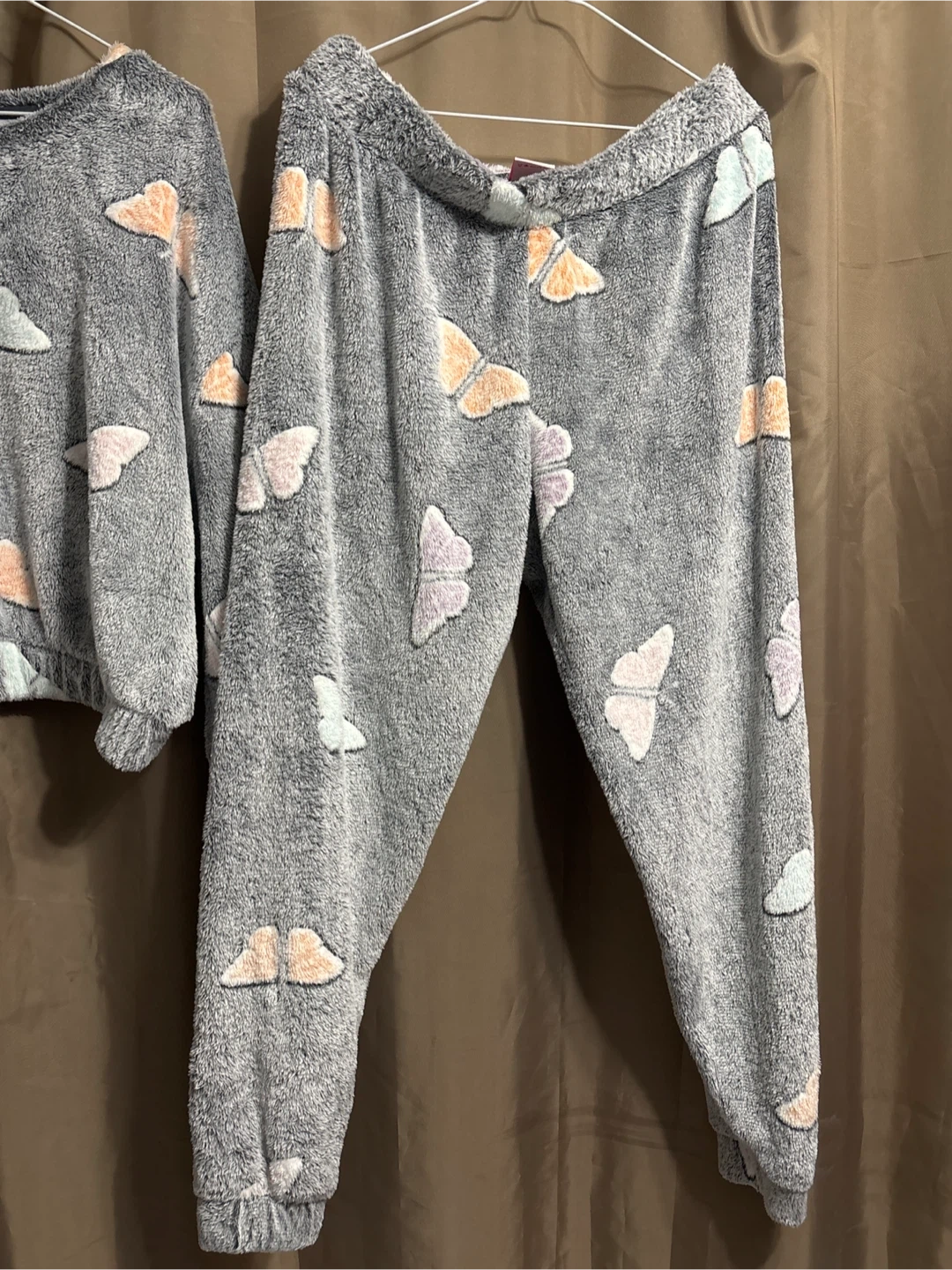 This is a cozy fluffy pajama set from NO BOUNDARIES. It includes a long-sleeved top and matching pants. Both pieces are made of 100% polyester and feature a grey base with colourful butterfly and cloud appliques. They're size XL/TG.