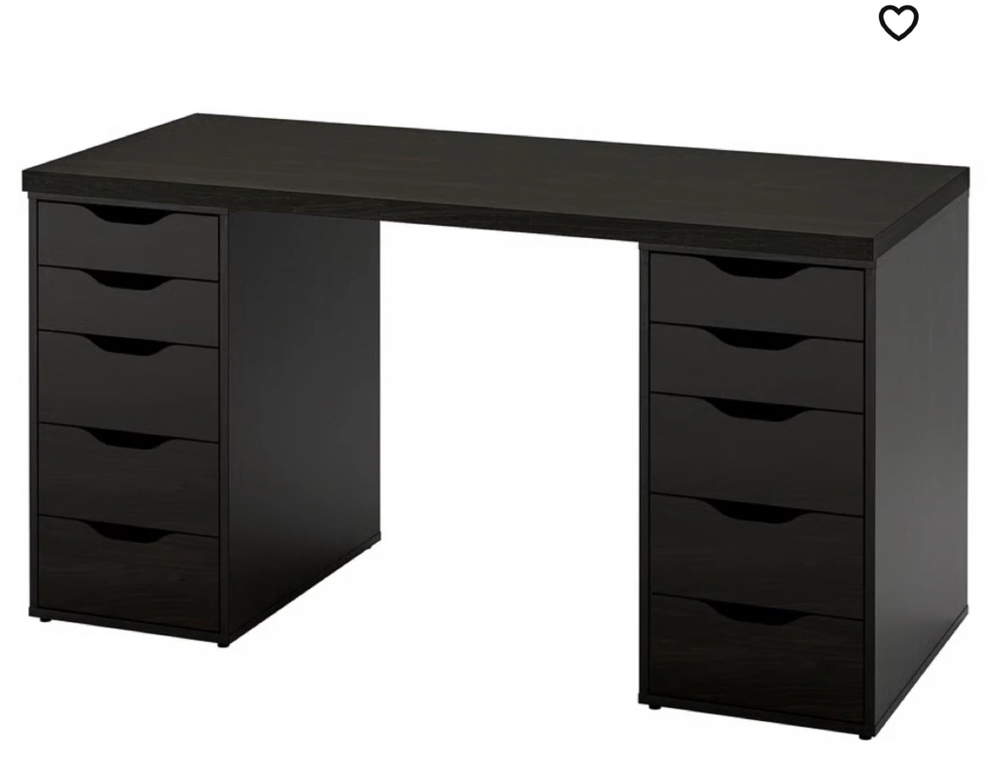 A wide IKEA desk with two drawer units for ample storage. It's black and features a spacious tabletop. This desk is great for organizing your workspace or creative projects.