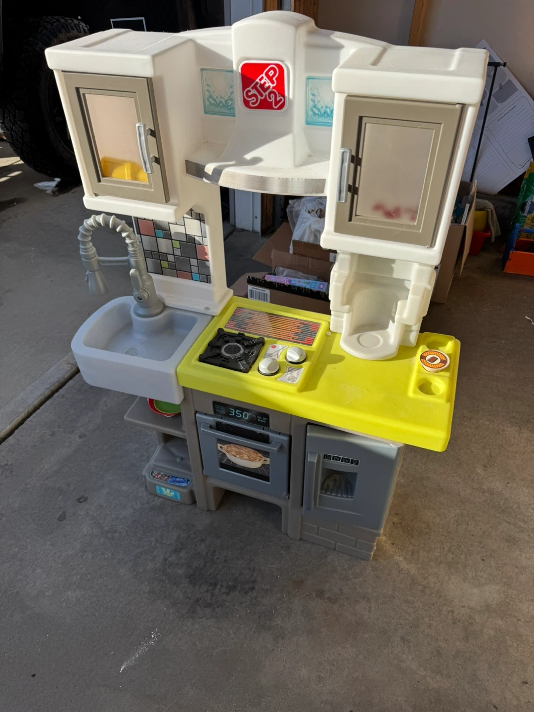 This is a Step2 play kitchen for kids. It features a stovetop with knobs, an oven, a sink with a faucet, and cabinets. The oven displays a temperature of 350 degrees.