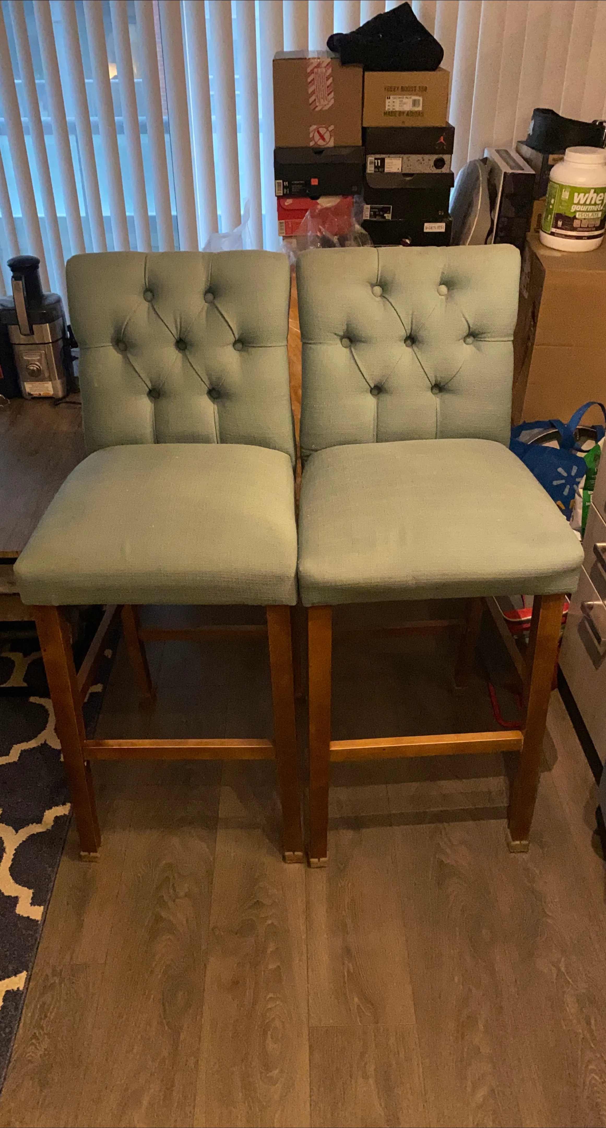 Selling a set of two bar stools. They are a light green colour with a tufted back. Perfect for a kitchen island or bar area!