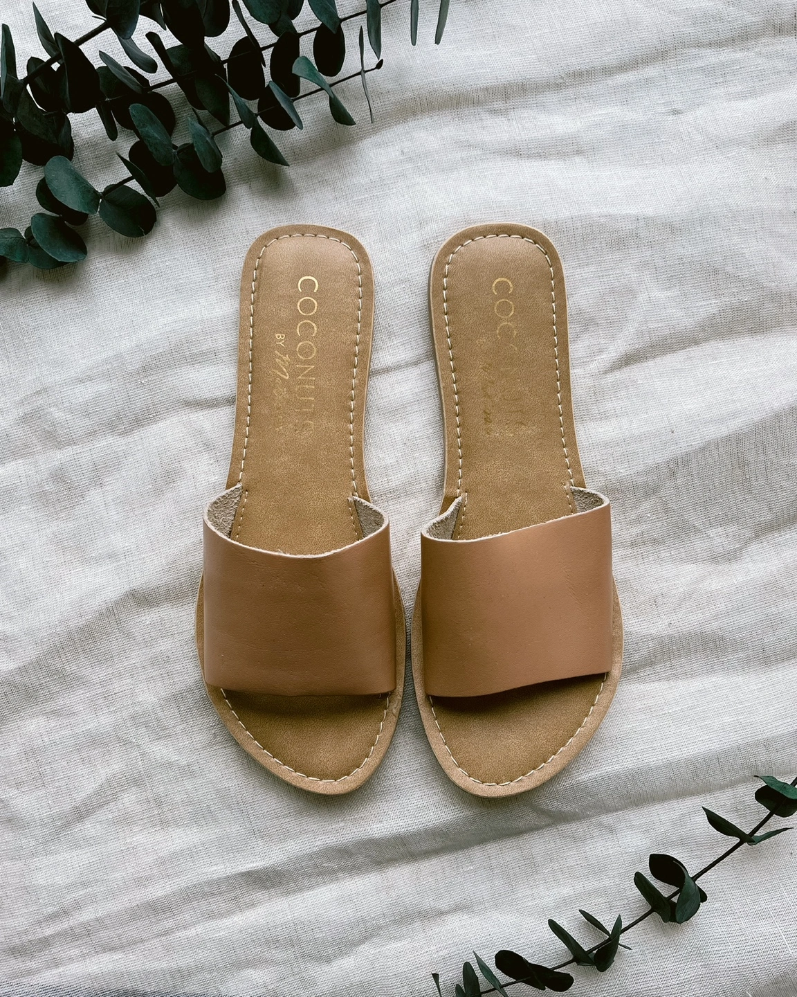 Beautiful tan brown slides from ecofriendly LA-based brand “Coconut by Matisse”