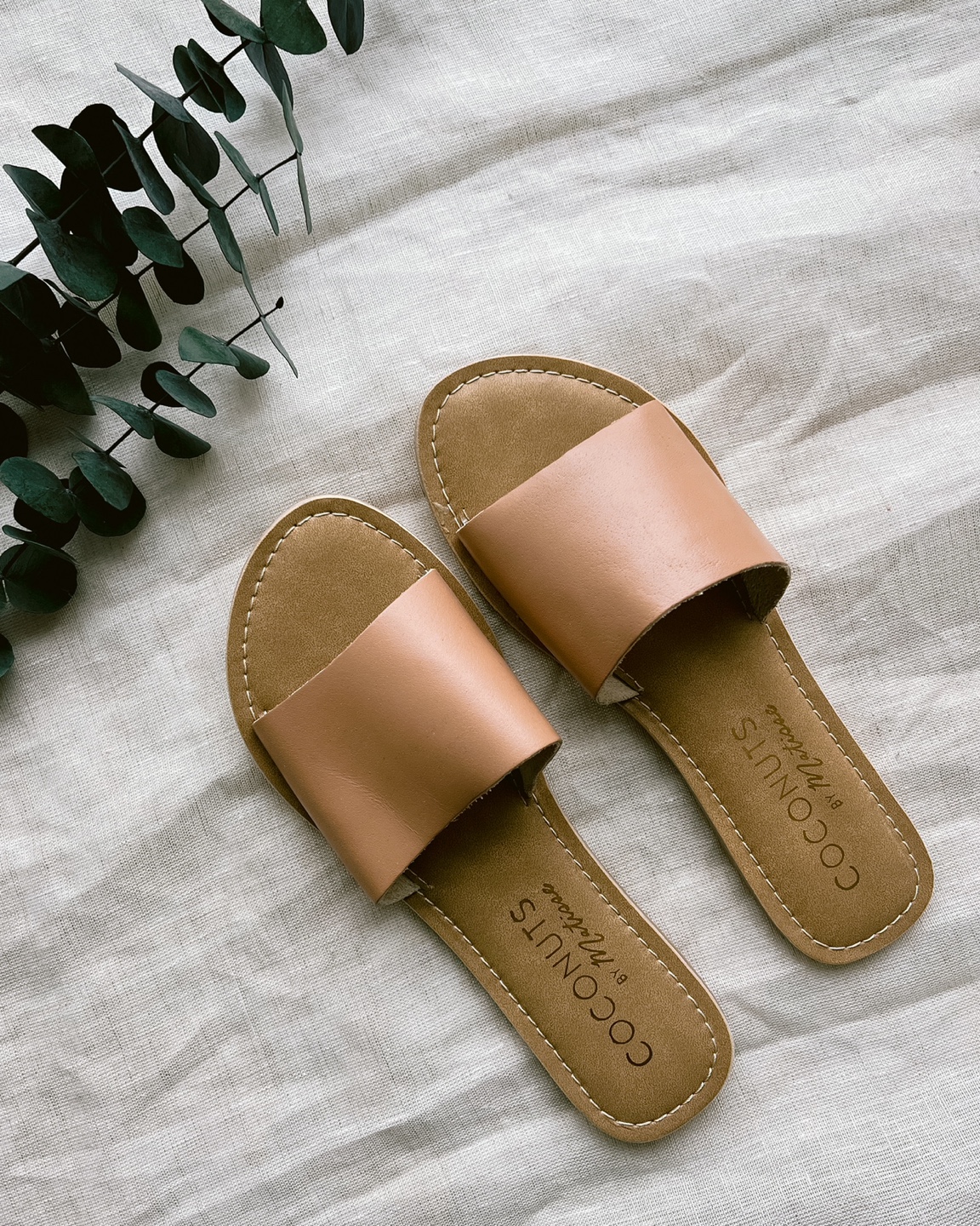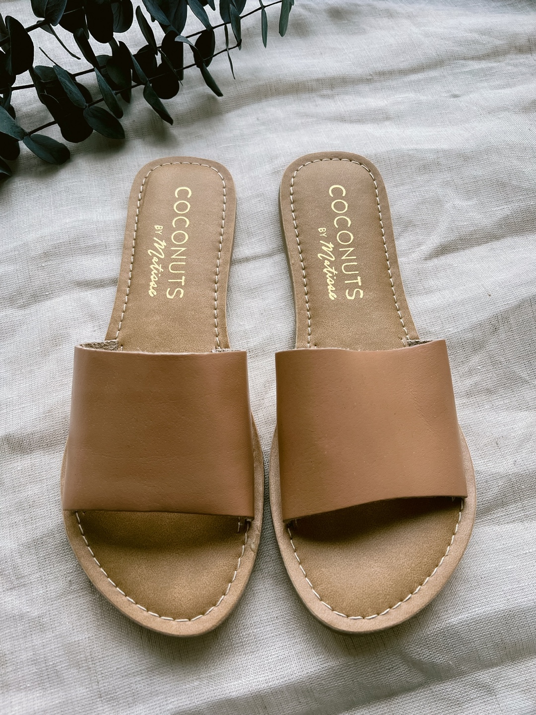 Beautiful tan brown slides from ecofriendly LA-based brand “Coconut by Matisse”