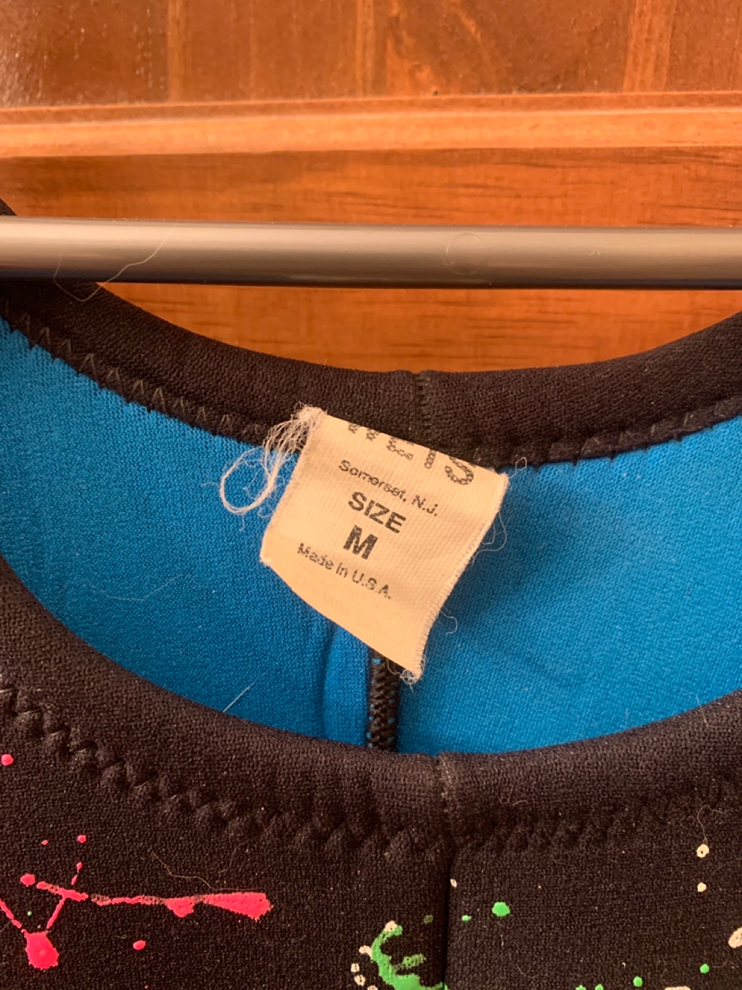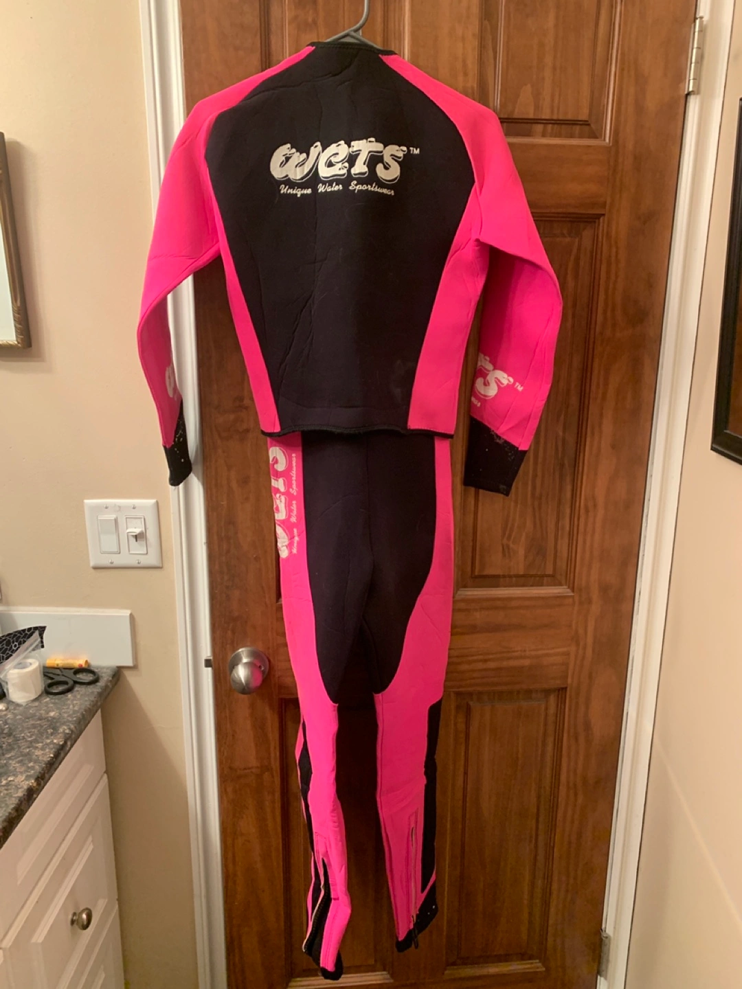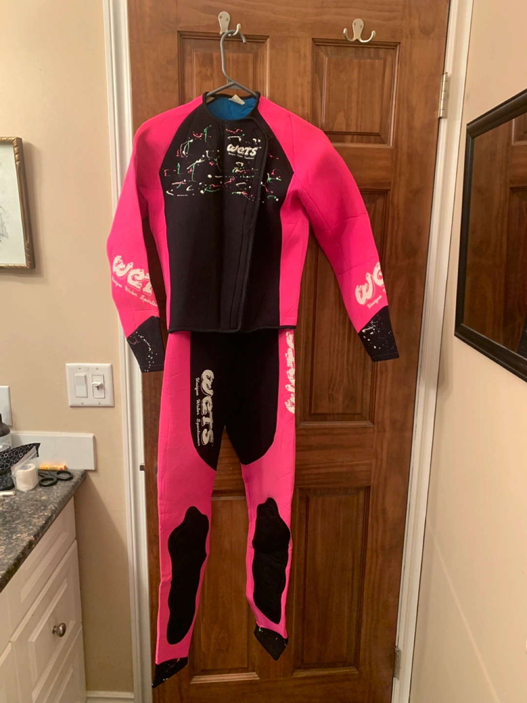 Vintage women's wetsuit. Pink and black. Size Medium. Long sleeves and legs. Some paint splatter design. Made in the U.S.A. 2.5mm thick.
