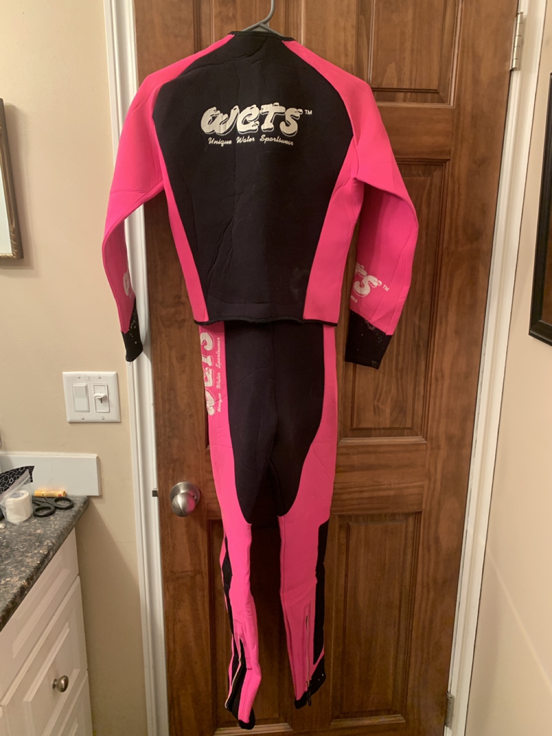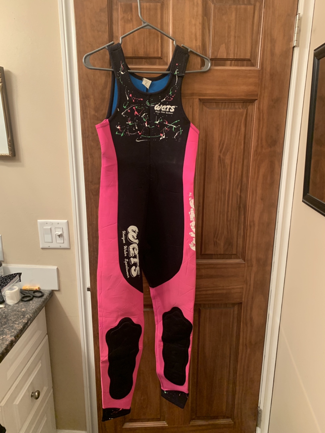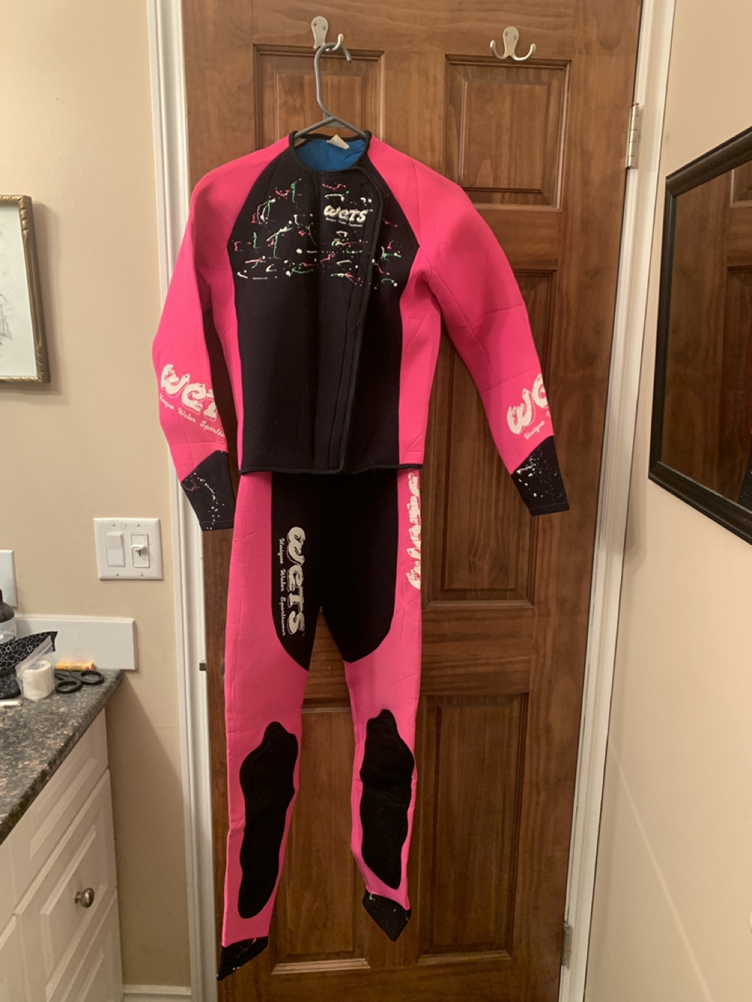 Vintage women's wetsuit. Pink and black. Size Medium. Long sleeves and legs. Some paint splatter design. Made in the U.S.A. 2.5mm thick.
