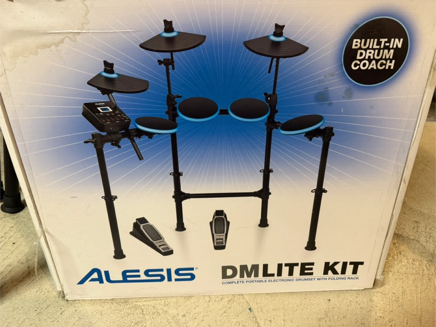 This is an Alesis DM Lite Kit, a complete portable electronic drumset with a folding rack. It includes drum pads, cymbals, pedals, and a drum coach feature. This kit is great for beginners looking to practice and learn drumming.