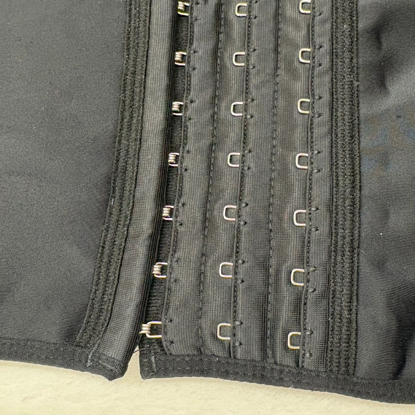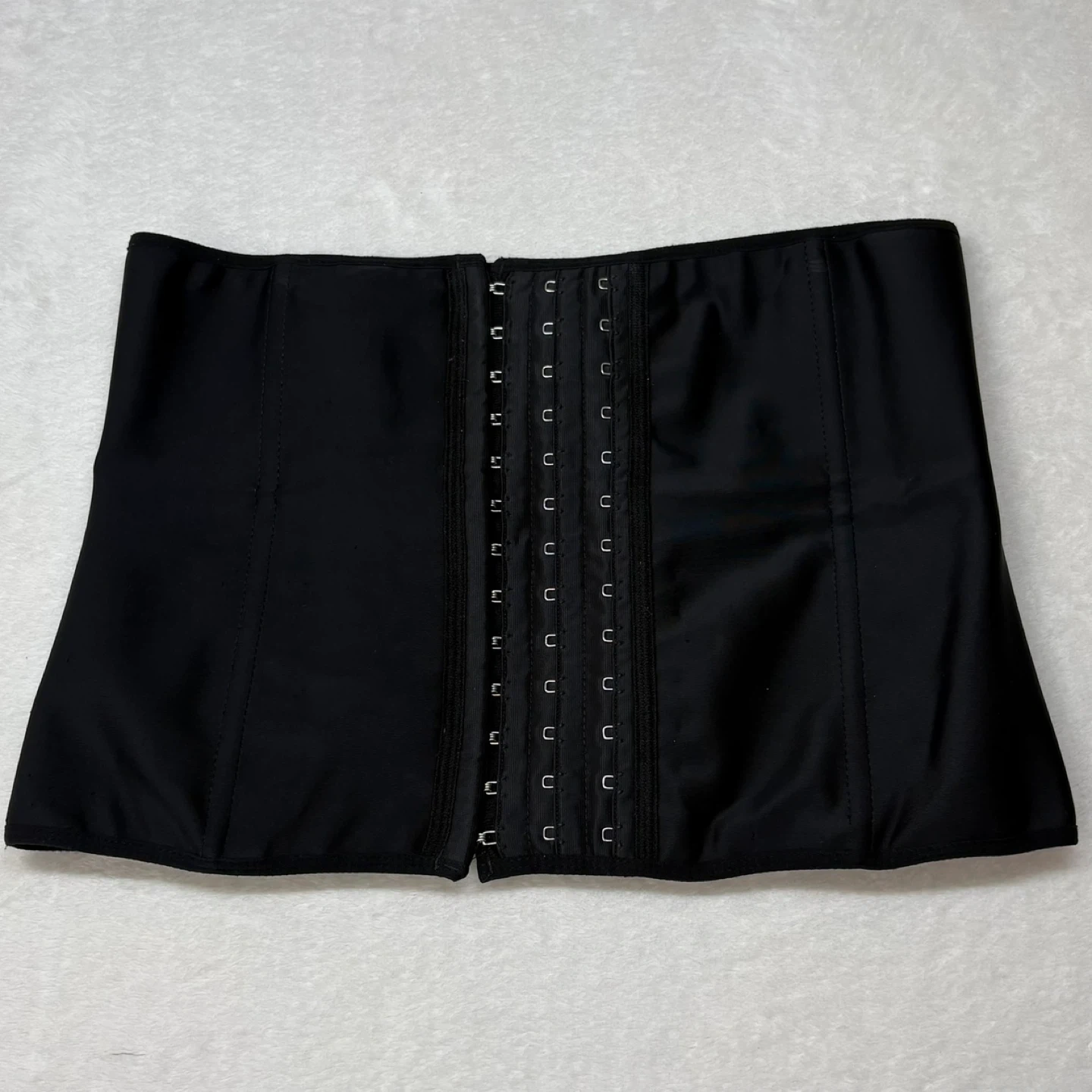 This high-compression waist cincher features a matte solid exterior with three rows of hook-and-eye closures and internal steel boning for structure.