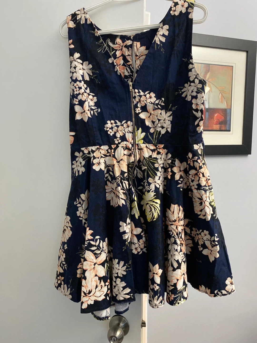 A navy sleeveless dress with a lovely all-over floral print. It features a zipper closure at the back. This dress is perfect for warmer weather occasions.