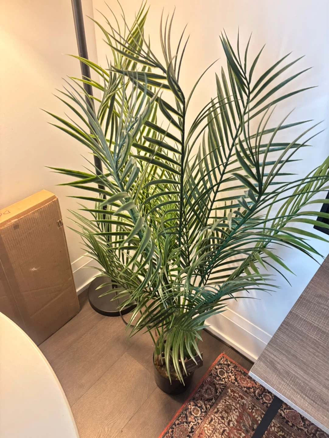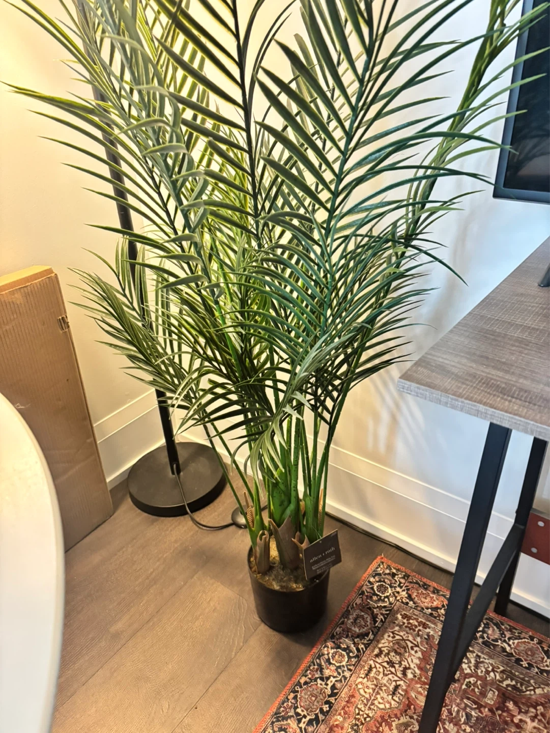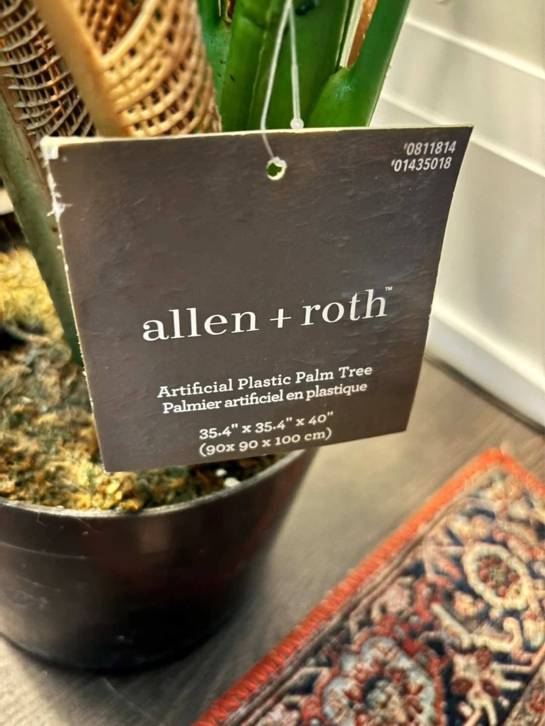 Tag on. Allen + Roth artificial palm tree. Dimensions are 35.4 inches by 35.4 inches by 40 inches (90 cm x 90 cm x 100 cm). This faux plant adds a touch of greenery to your space.