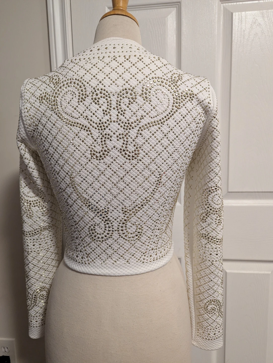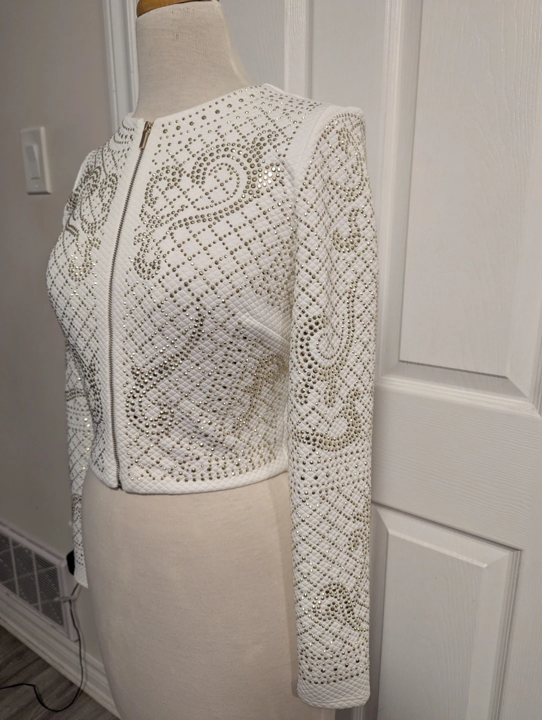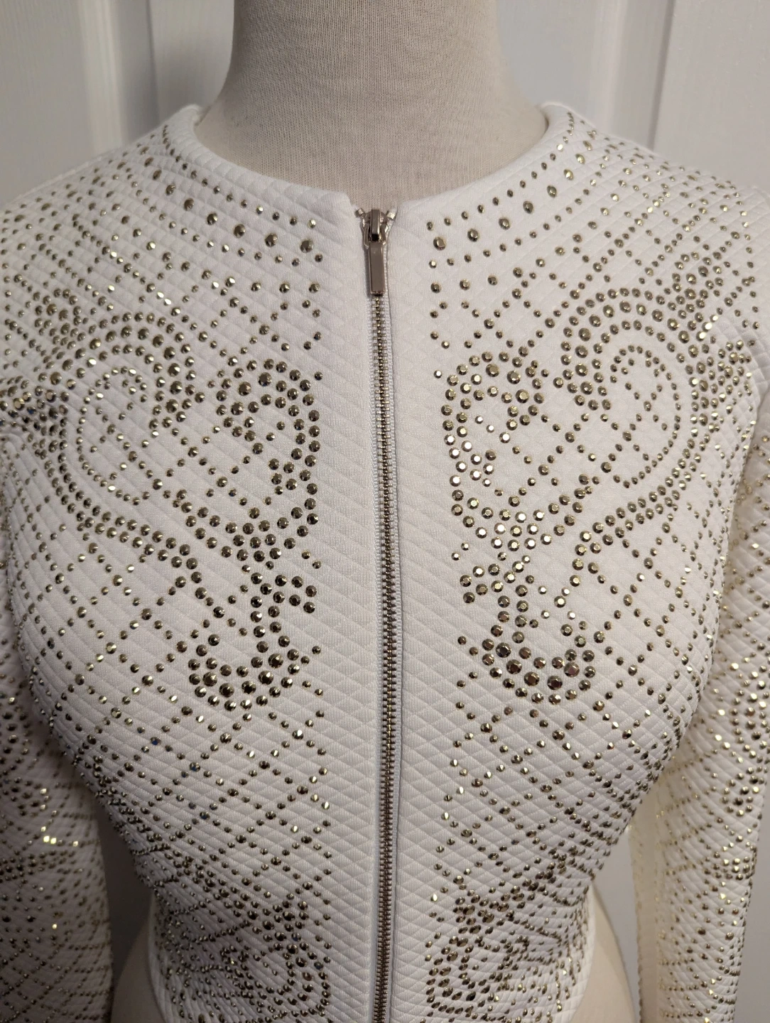 White cropped jacket covered in intricate silver and gold embellishments. Features a zip-up front closure and long sleeves. This stylish jacket is perfect for adding a touch of sparkle to any outfit!