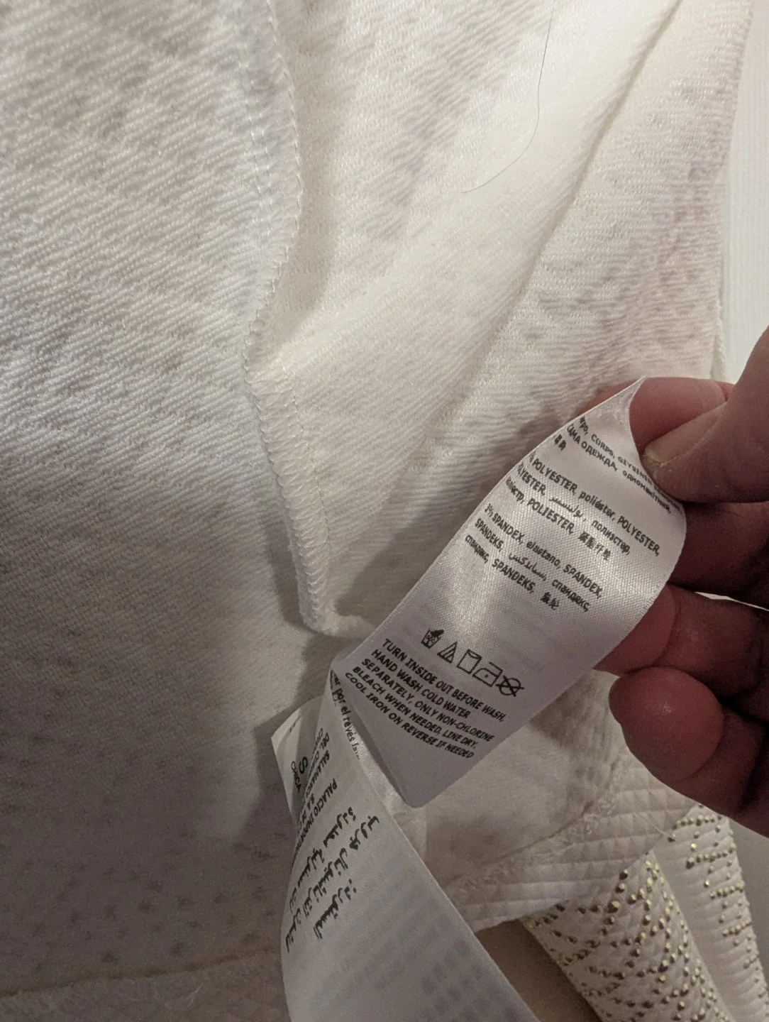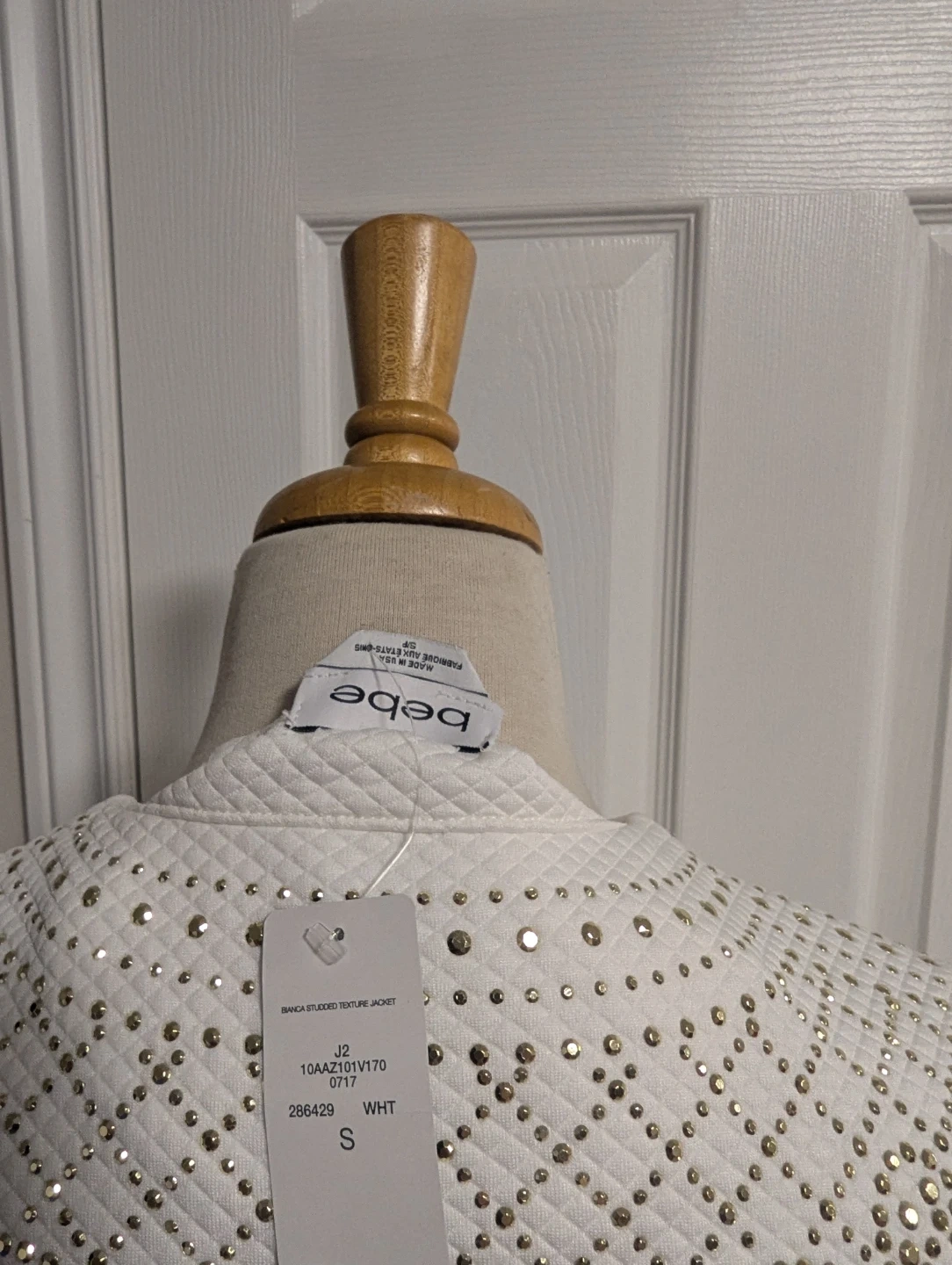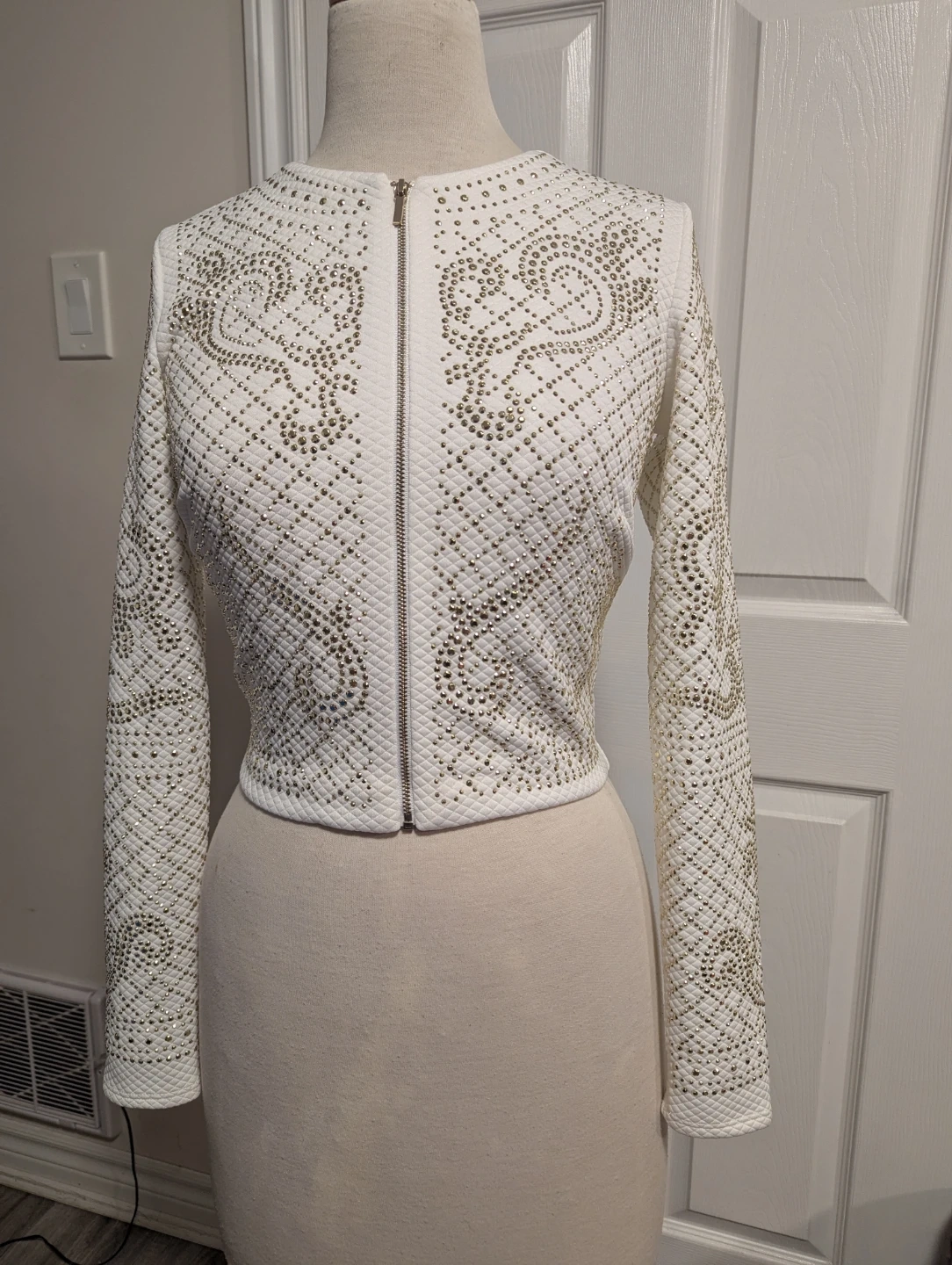 White cropped jacket covered in intricate silver and gold embellishments. Features a zip-up front closure and long sleeves. This stylish jacket is perfect for adding a touch of sparkle to any outfit!