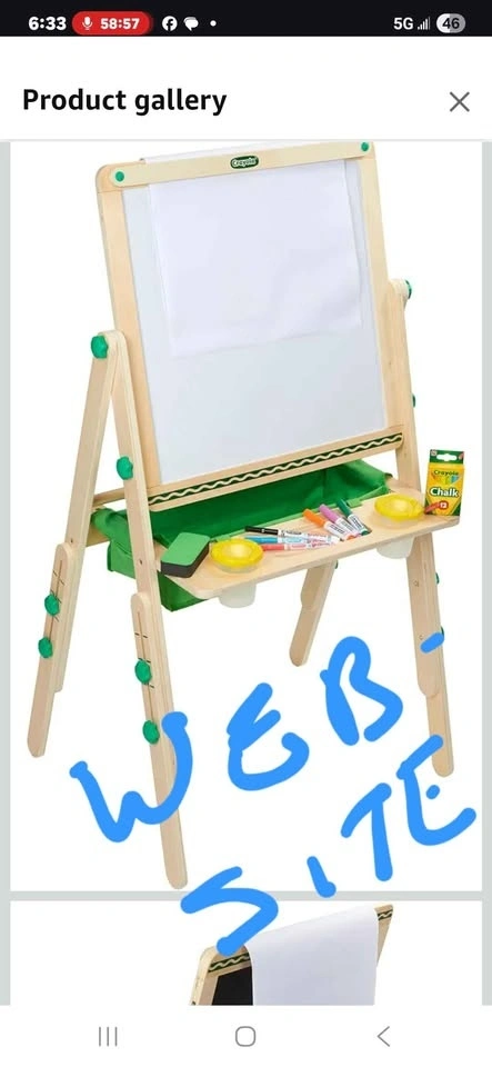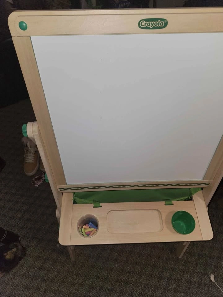 This is a used Crayola Deluxe Wooden Art Easel that has been restored and is ready for a new home. It's sturdy and height-adjustable, perfect for your little artist. It includes the easel, 2 paint pots (1 added), an eraser, used chalk, and a fabric bag. The dual-sided board features a magnetic dry-erase side and a chalkboard.