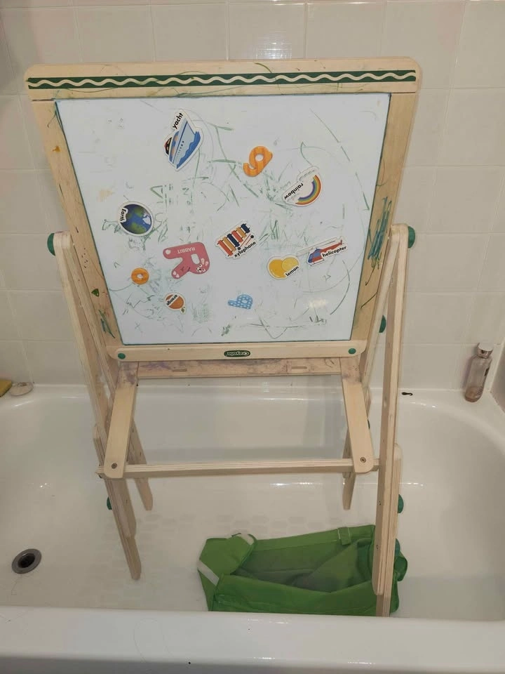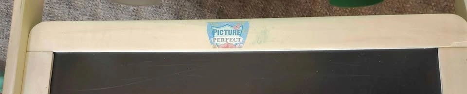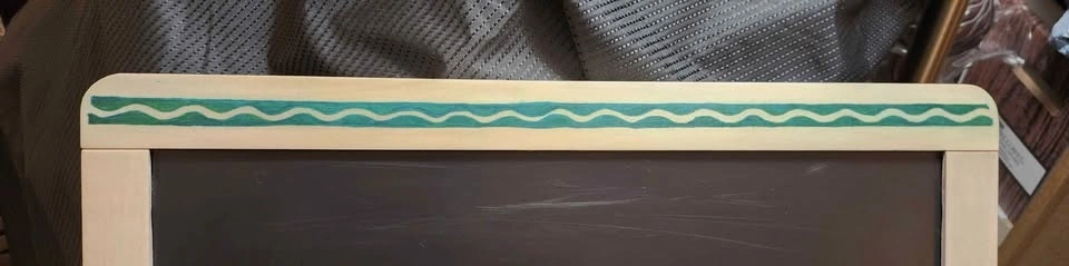 Some noted cosmetic details: the magnetic dry-erase board has minor scratches that don't affect use (see photo). The chalkboard had a sticker removed, leaving some old paint stains (see photo). Green waves were added to the chalkboard with a paint pen and have very light smudging from the sealant (see photo). A new paper roll holder was created as the original was missing (see photo). The knobs to switch between the board sides don't tighten fully but hold the chalkboard in place.