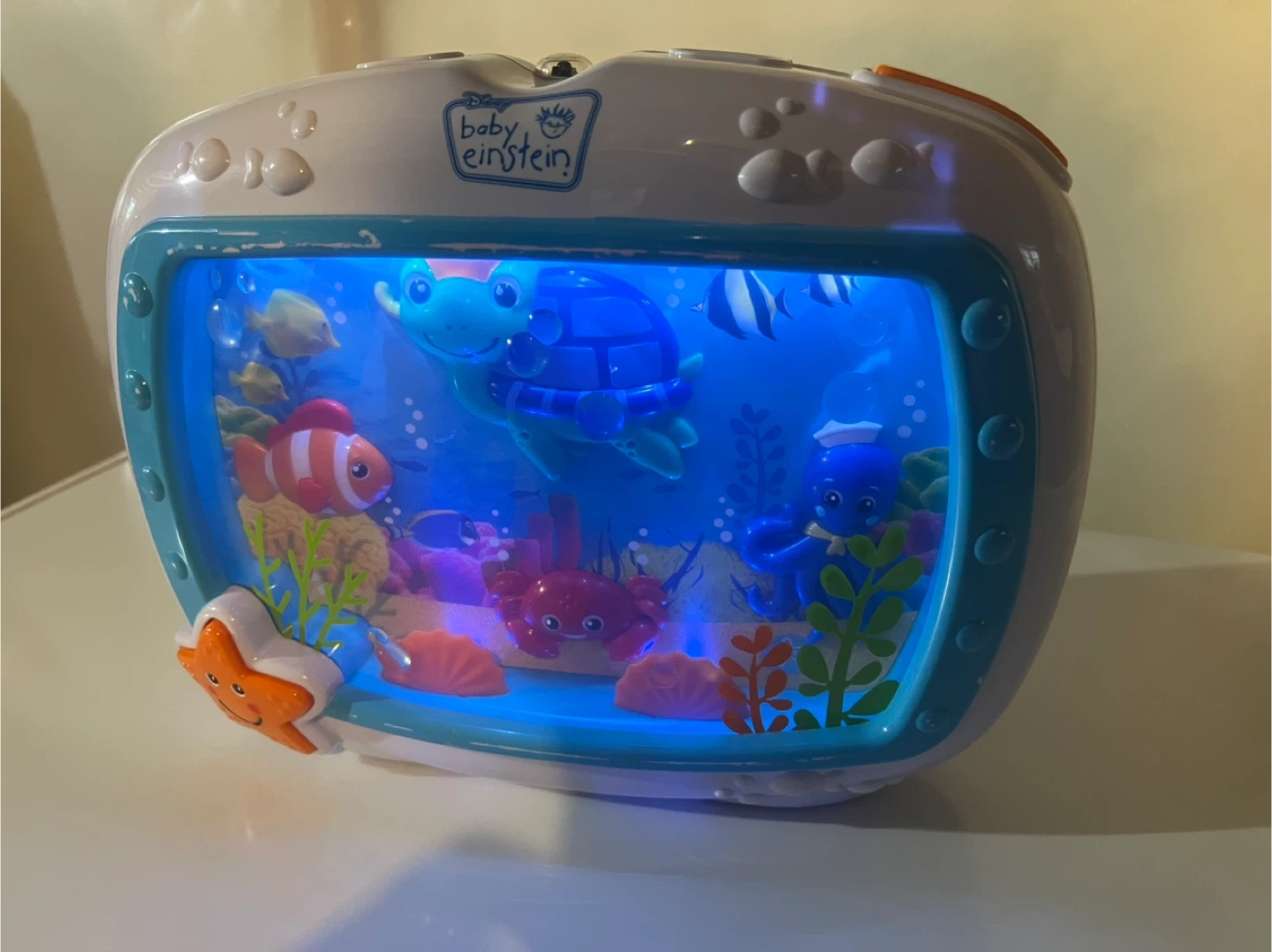 This Baby Einstein Sea Dreams Soother features a tranquil aquarium with underwater scenes and lights. It projects soothing lights and plays calming melodies. It's perfect for helping babies drift off to sleep!
