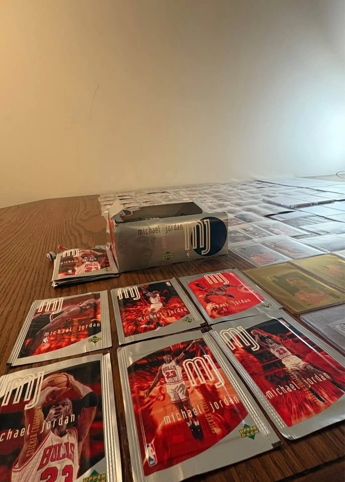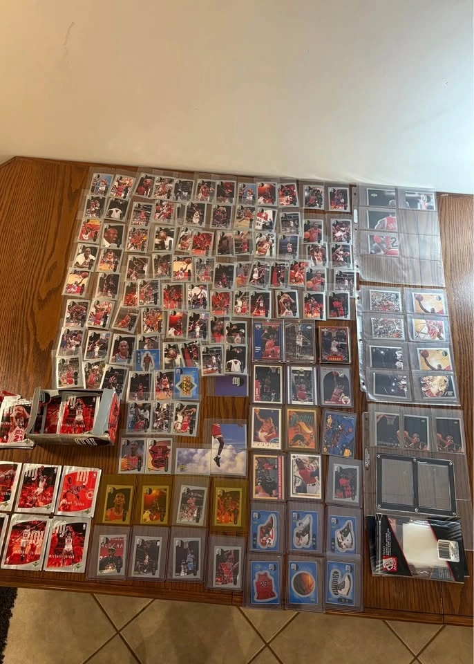 Serious Michael Jordan collection for sale. Cards and stickers span 1990–2003, including Upper Deck, Fleer, Flair, and MJ insert series. Highlights include: 1990–91 Fleer #29, 1991 Fleer #206 Bulls Guard, 1997 Upper Deck #152, 1990 SP / SP1 Michael Jordan Baseball Card, 2003 Michael Jordan insert cards, 1998 Michael Jordan sticker box (mostly sealed), multiple sealed sticker packs + near-complete sticker runs, and several cards stored in hard cases. Collection is mostly raw, ungraded, and in good condition. This is a single curated lot, not picked-through commons. Asking $995 OBO.