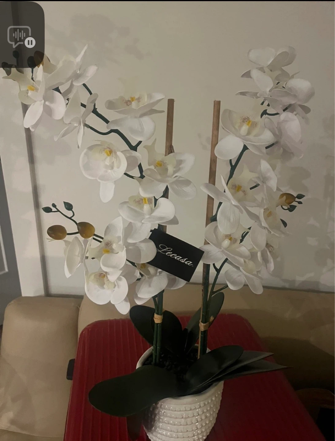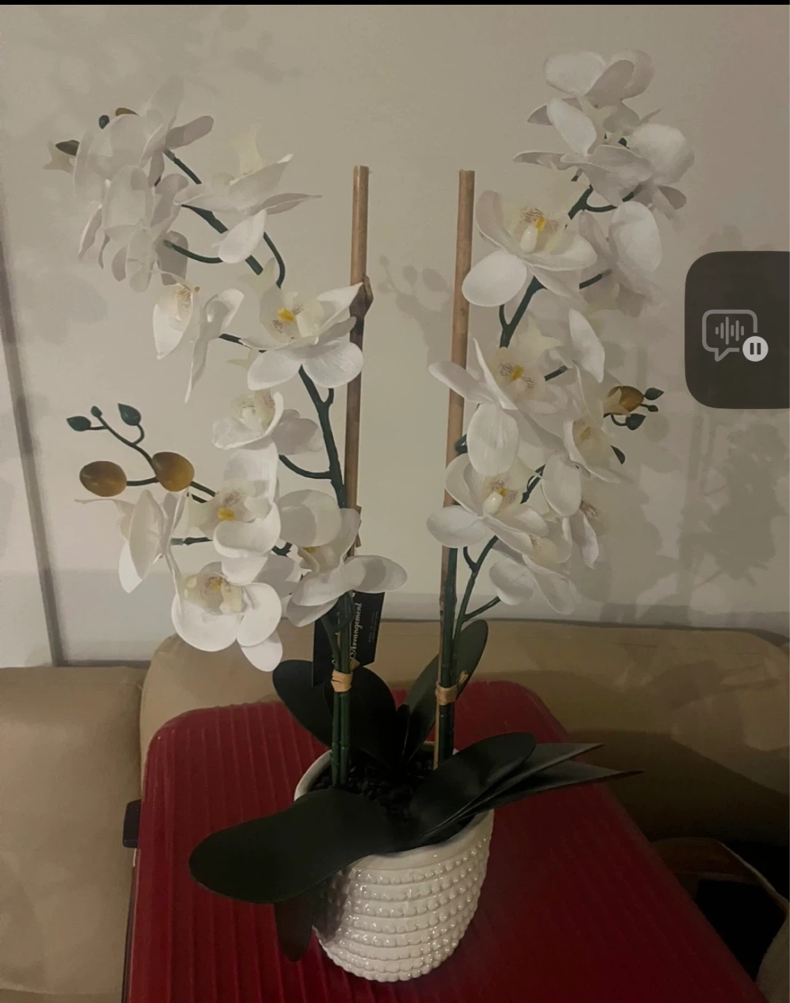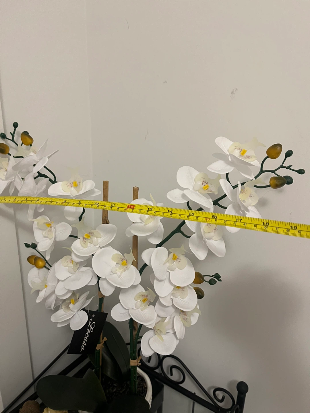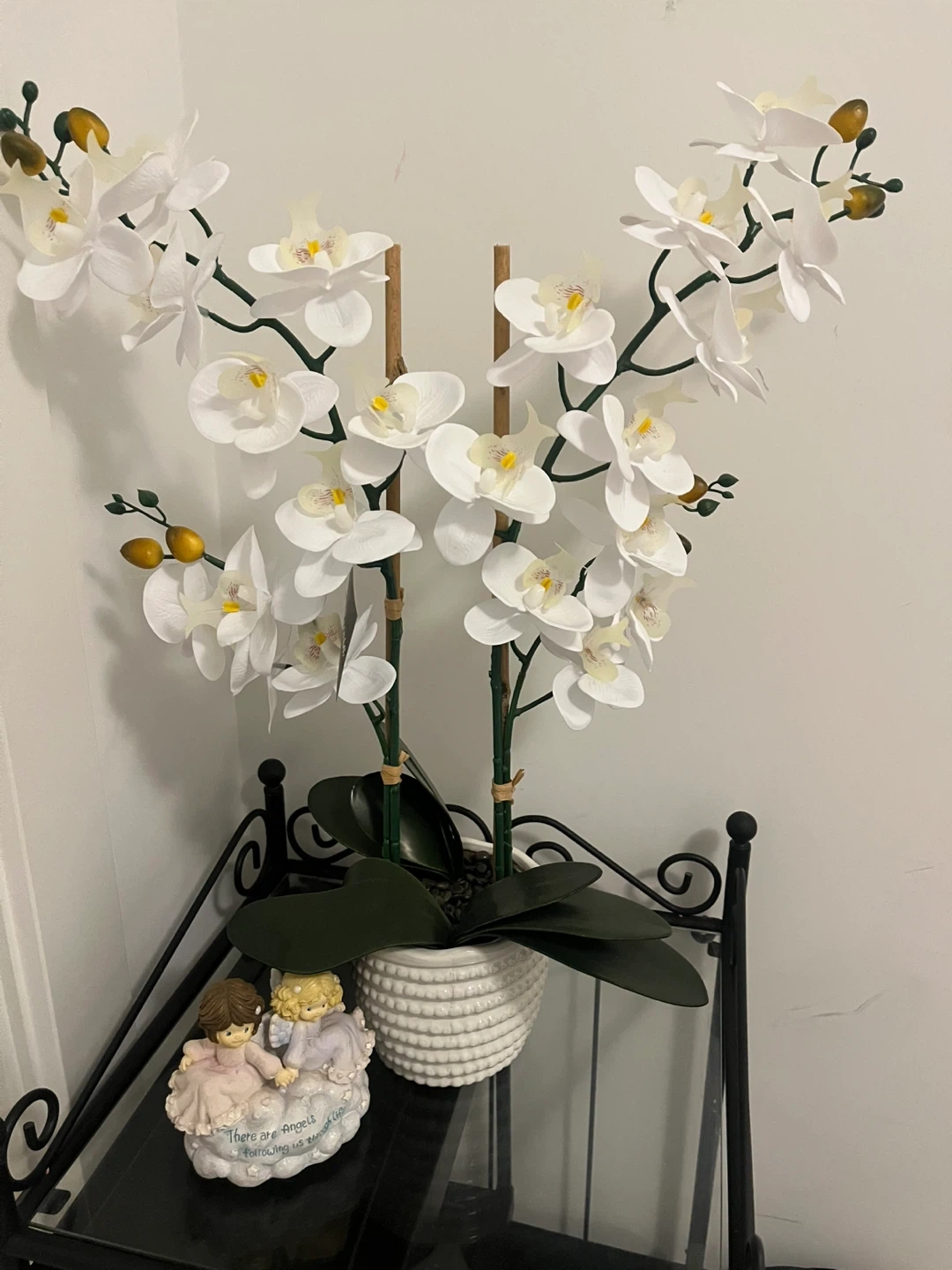 Realistic artificial white orchid arrangement in a textured white pot. Features multiple blooms and green leaves, supported by natural wood stakes. It's a lovely decorative piece for any room.