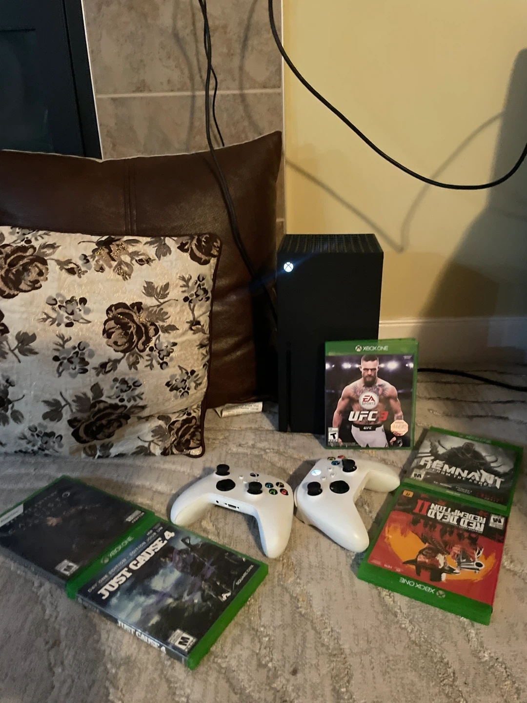 Includes an Xbox Series X console, two white controllers, and games: Forza Horizon 5, UFC, Remnant: From the Ashes, Red Dead Redemption 2, and Just Cause 4. Power cable included. Perfect for gaming enthusiasts!