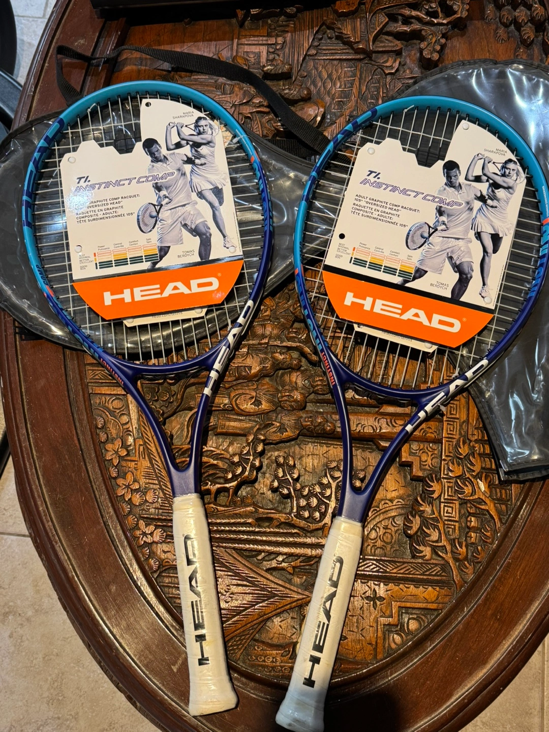 Two HEAD Instinct Comp tennis racquets. 71 inch size. New, never used. Come with protective covers.