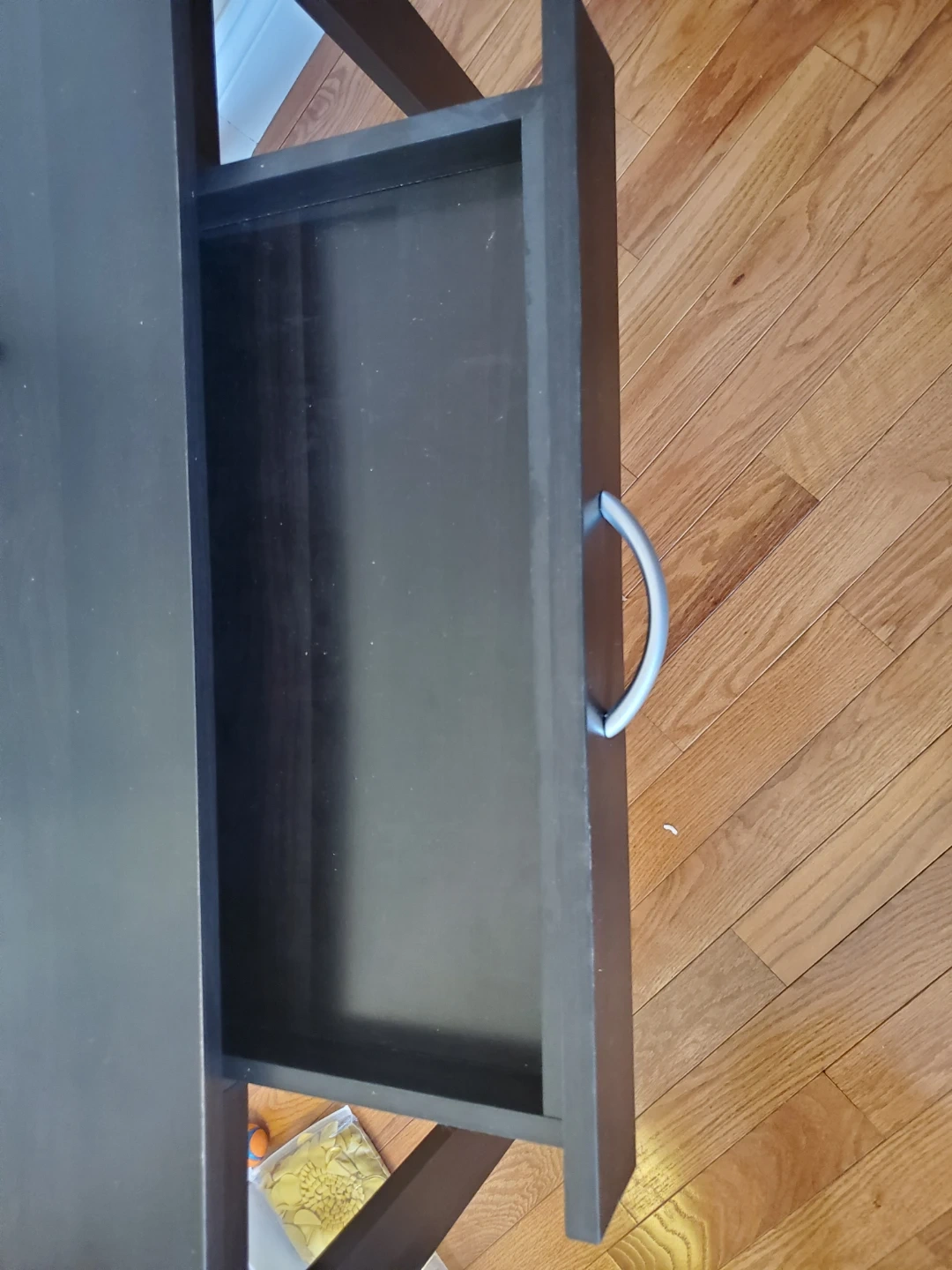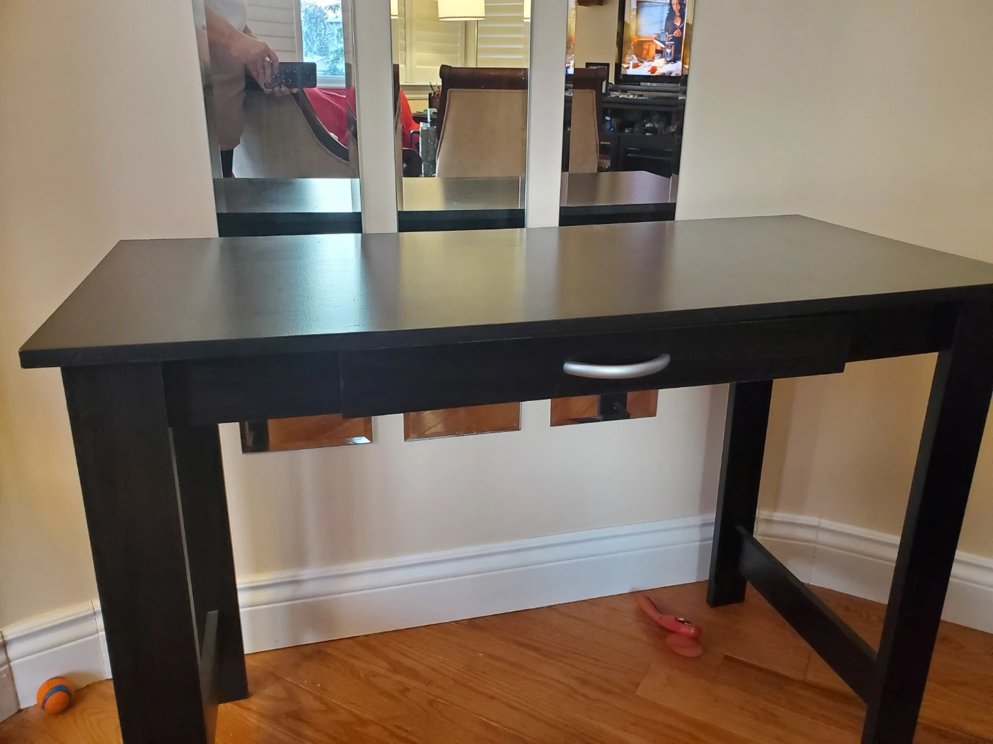 Selling a black wooden desk with a drawer. It's in good condition and perfect for a home office or study space. The desk has a simple, clean design that will fit well with any decor.