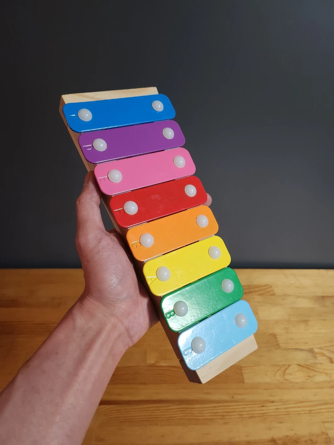 - Playing: Hold the mallet lightly by the handle and strike the center of the colored metal bars. A quick, "bouncing" strike will produce a clearer, ringing tone than a heavy, lingering strike.