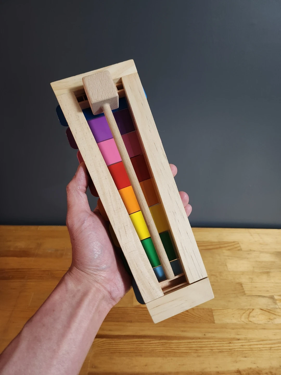 - Storage Case: The wooden frame doubles as a protective case or stand, and the wooden mallet fits neatly into a slot within the frame for portability.