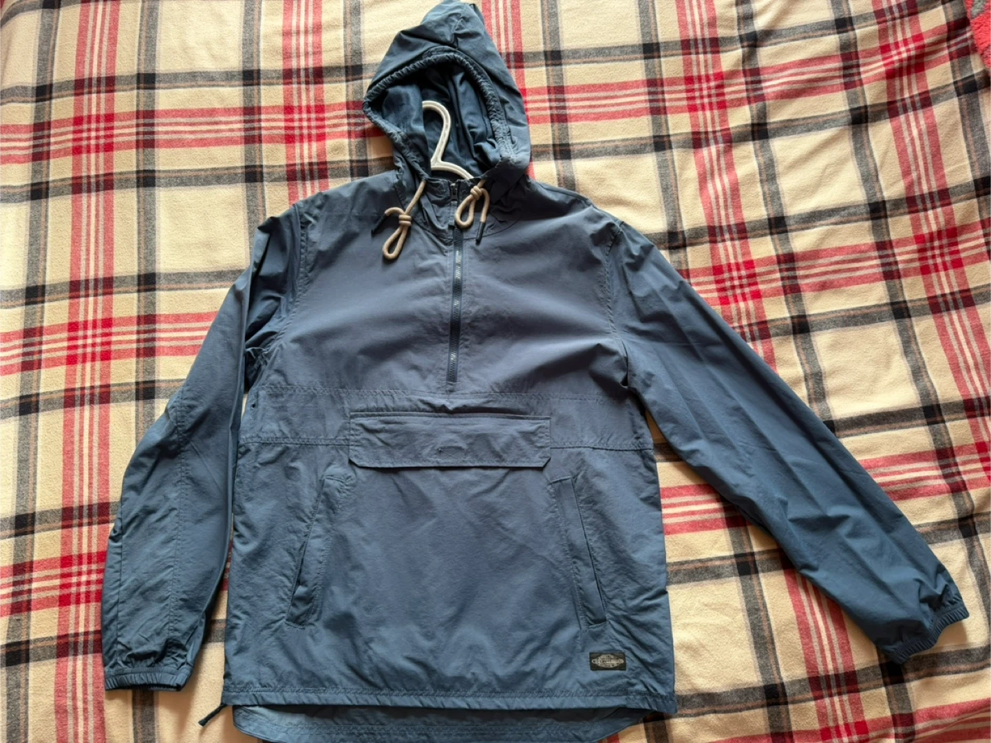 Lightweight blue pullover jacket with a hood. It features a half-zip closure and a front pouch pocket in addition to two side pockets. Made from durable material.