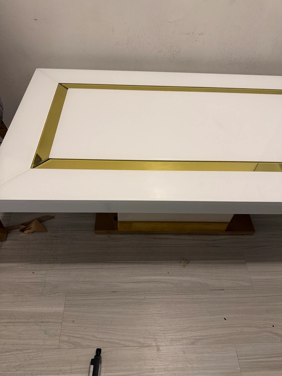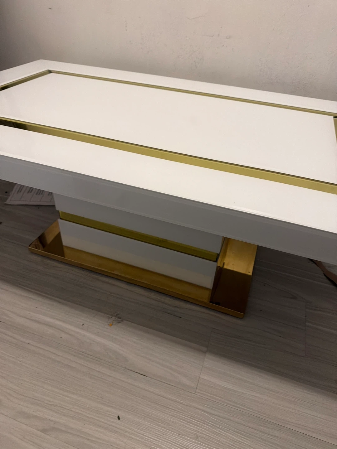 Selling a modern coffee table with a sleek white finish and elegant gold accents. It's in great condition and would be a stylish addition to any living room