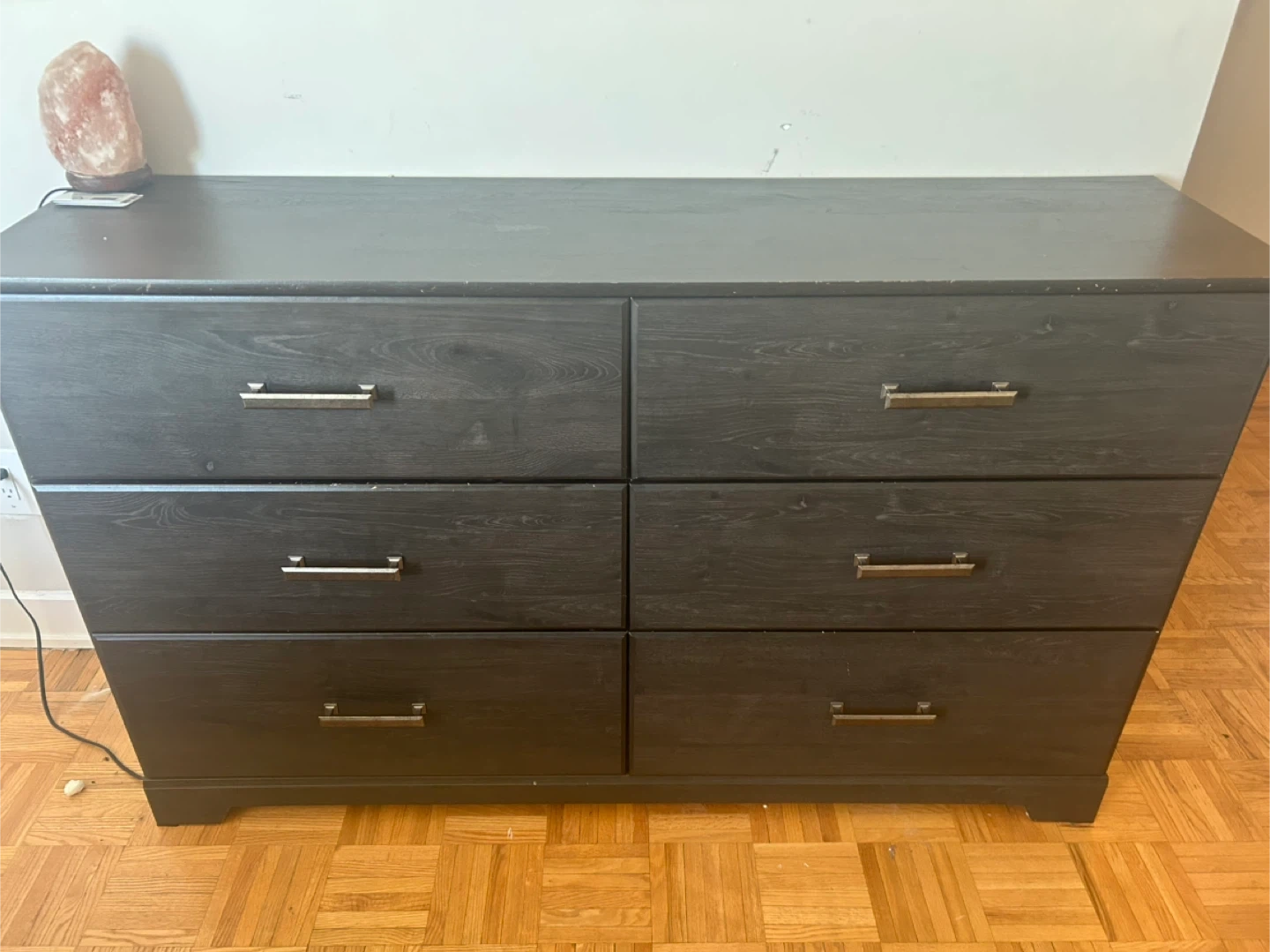 This dark grey dresser has six drawers with silver handles. It's made of wood with a visible grain. This dresser provides ample storage for clothing or linens.