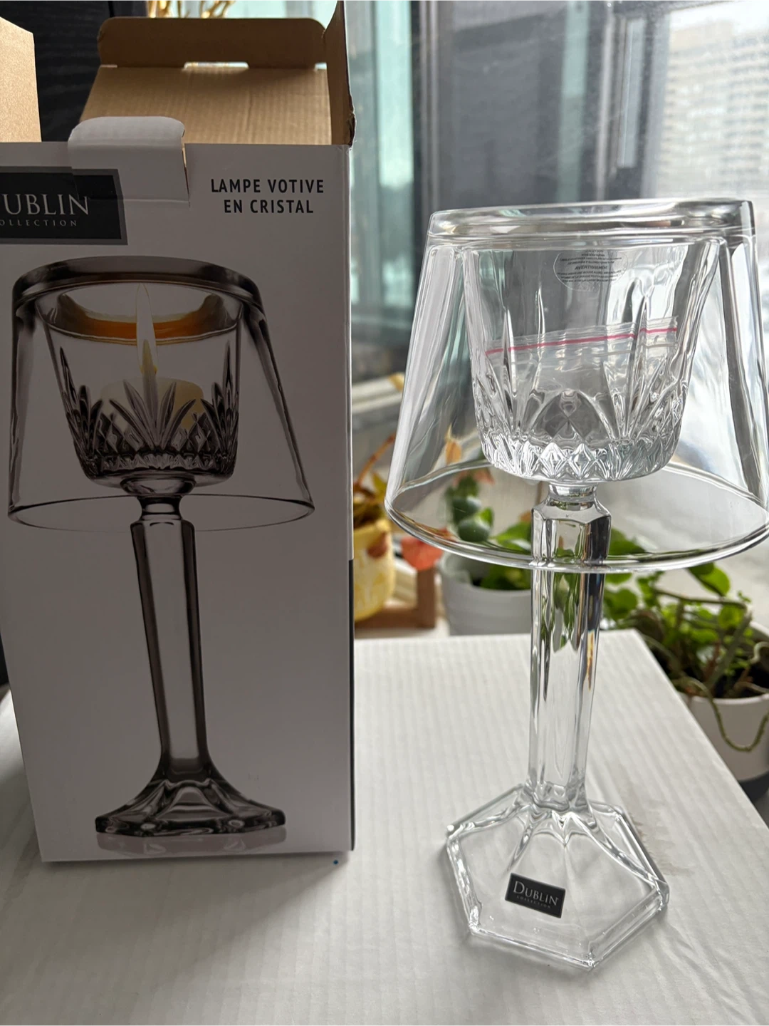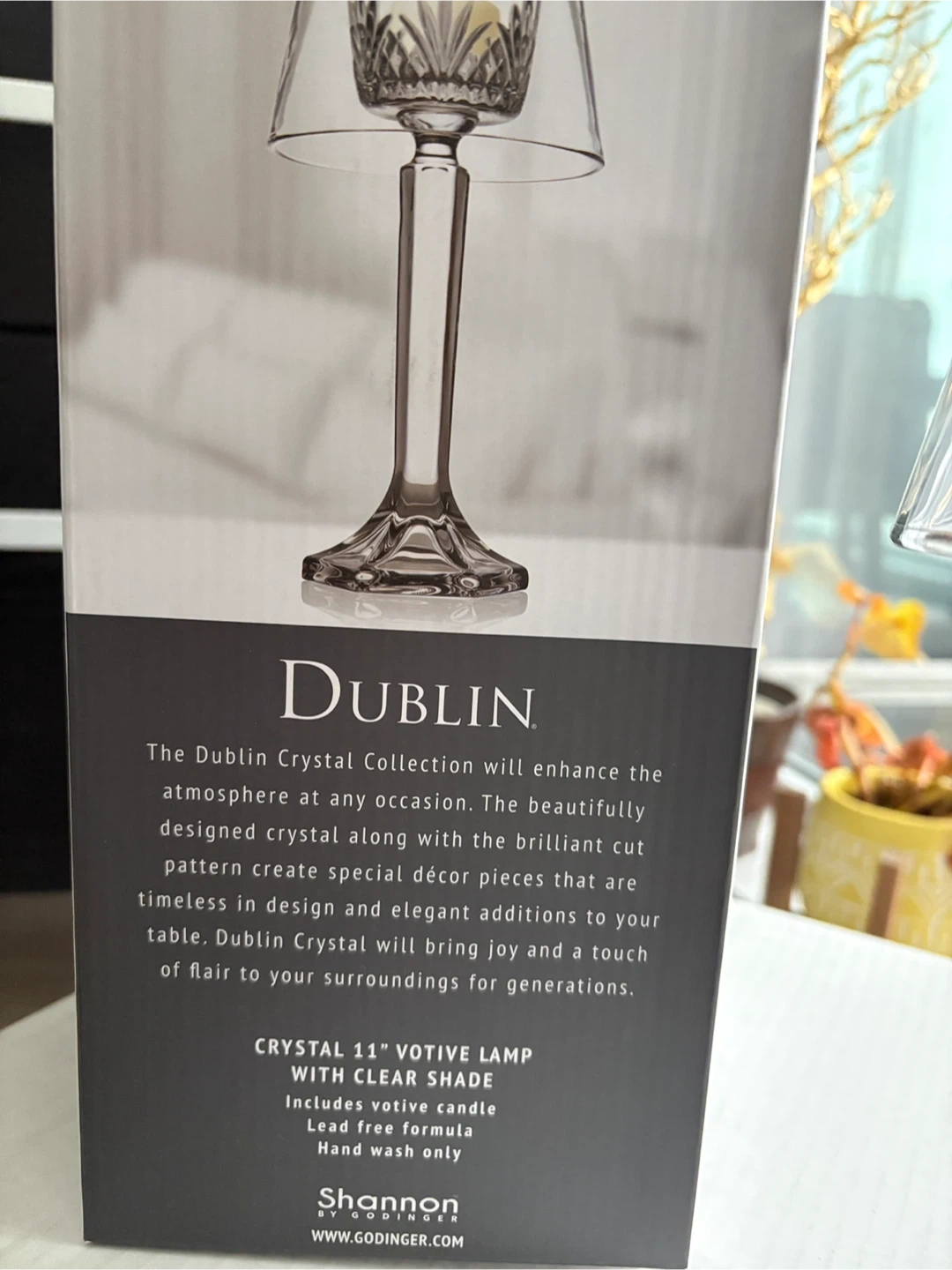 This is a Dublin Crystal Collection 11" votive lamp with a clear shade. It's made of lead-free crystal and includes a votive candle. Hand wash only.
