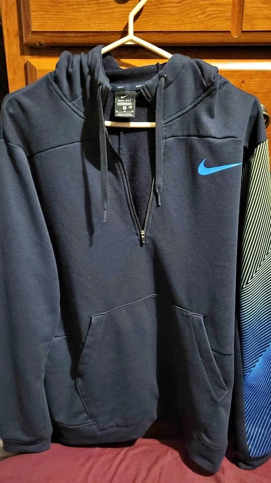 Authentic Nike Dri-FIT half-zip hoodie in a clean navy blue color with a blue Nike swoosh. Comfortable, sporty design with a front kangaroo pocket and hood—great for workouts, casual wear, or layering in cooler weather. Genuine Nike Dri-FIT moisture-wicking fabric. Half-zip front. Hooded with drawstrings. Men’s Medium – Standard Fit. No rips, stains, or damage. From a smoke-free home.