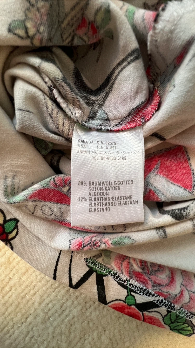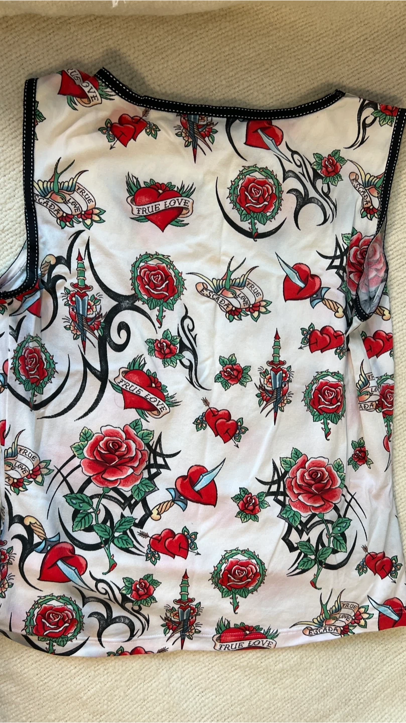 Escada stretch tank top featuring an all-over tattoo-inspired print with roses, hearts, daggers and “True Love” banners.