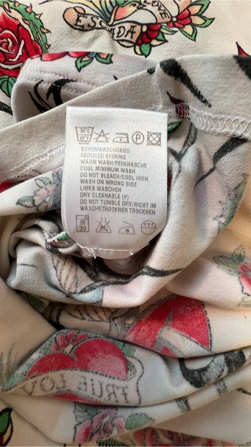 Escada stretch tank top featuring an all-over tattoo-inspired print with roses, hearts, daggers and “True Love” banners.