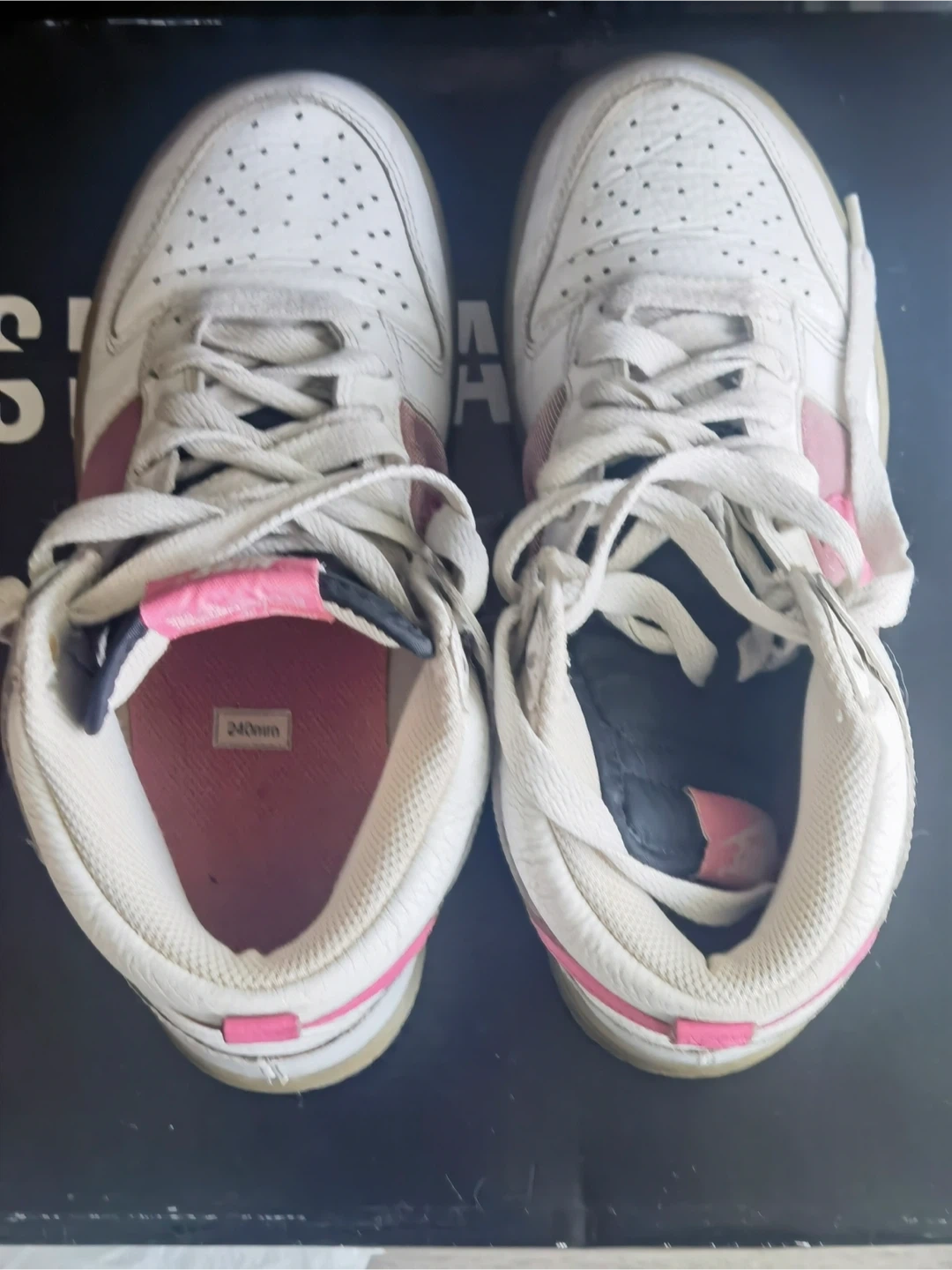White leather Nike Dunk High sneakers with pink accents. These are a women's size 240mm. They show some signs of wear, typical for used shoes.