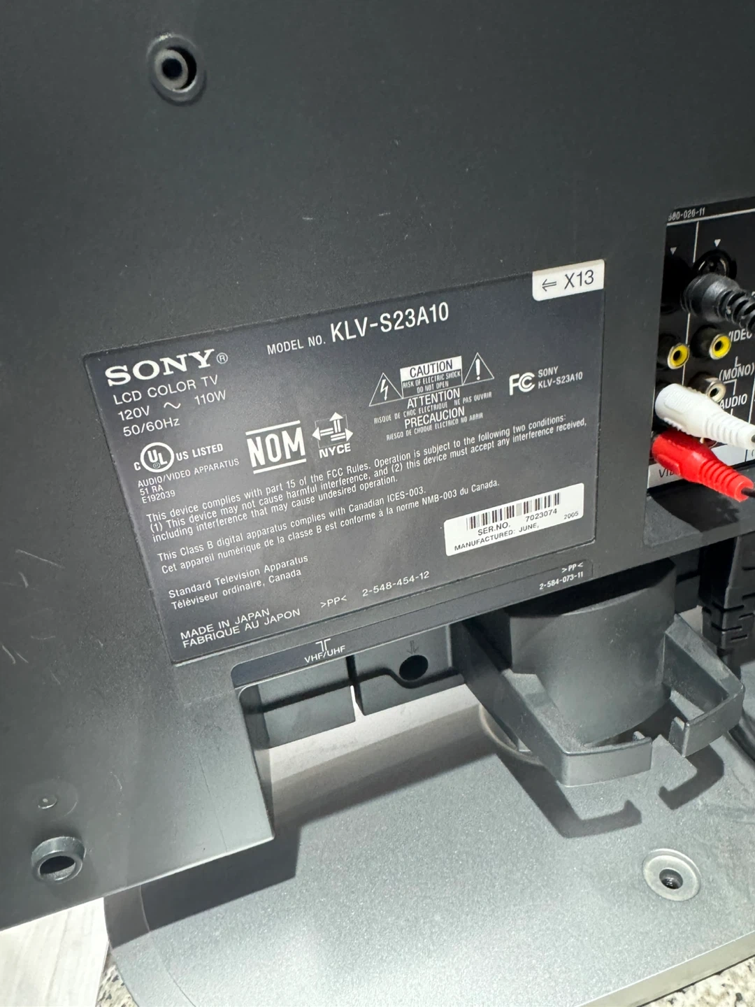 Selling a Sony WEGA LCD Colour TV, model KLV-S23A10. It's in good working condition and ready for a new home entertainment setup. The back panel shows various input options including S Video, Video, Audio and HDMI.