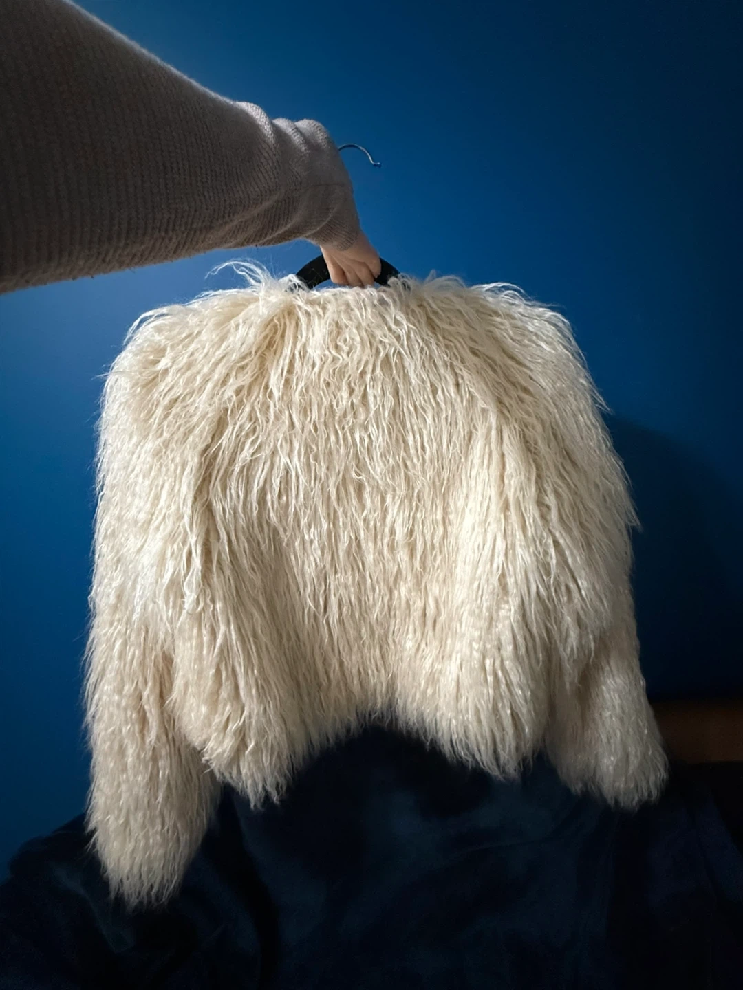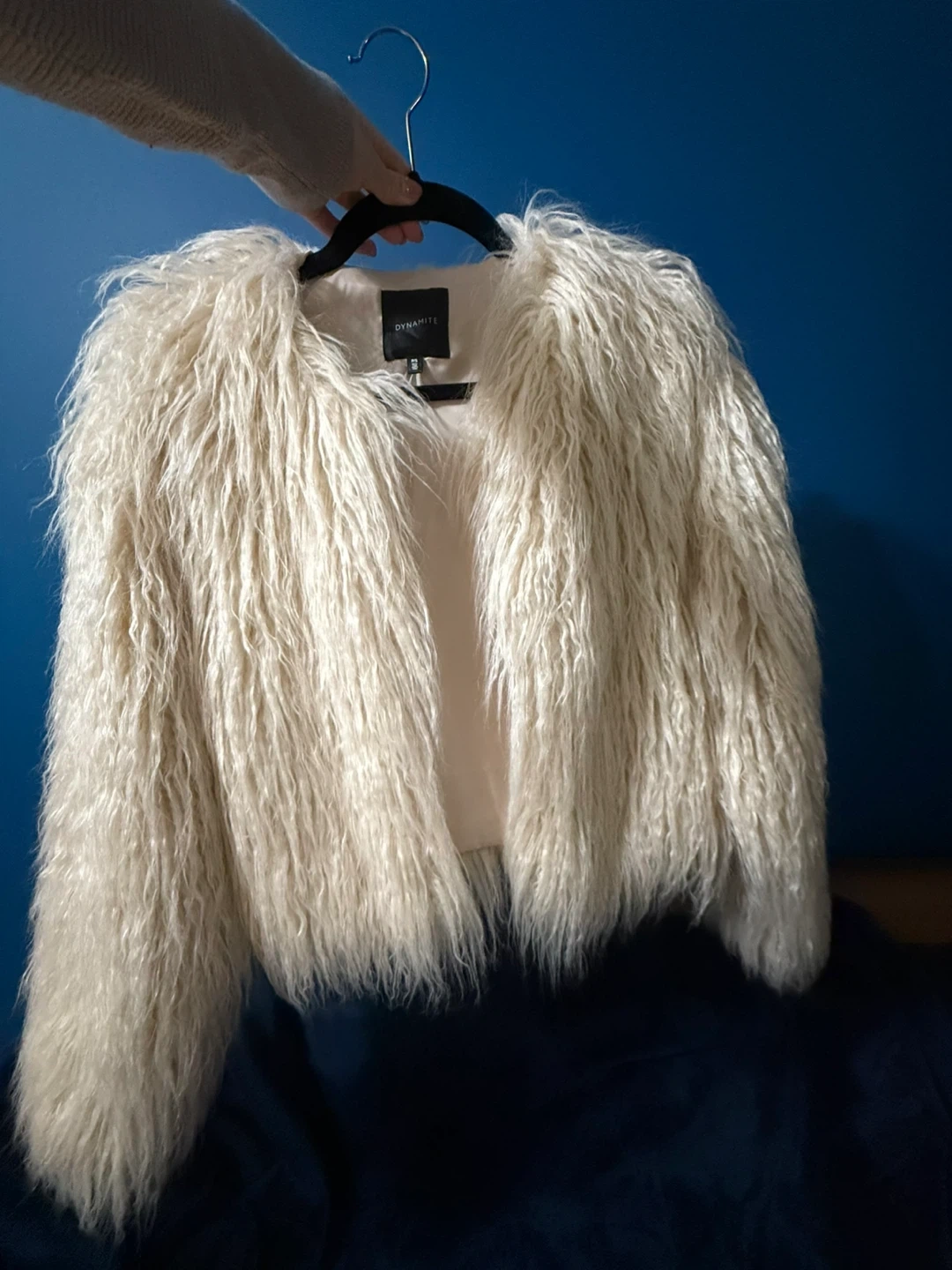 Cozy up in this cream-coloured faux fur jacket from Dynamite! It's in great condition and ready to add a touch of glam to your wardrobe