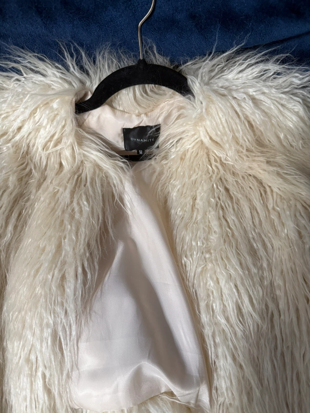 Cozy up in this cream-coloured faux fur jacket from Dynamite! It's in great condition and ready to add a touch of glam to your wardrobe