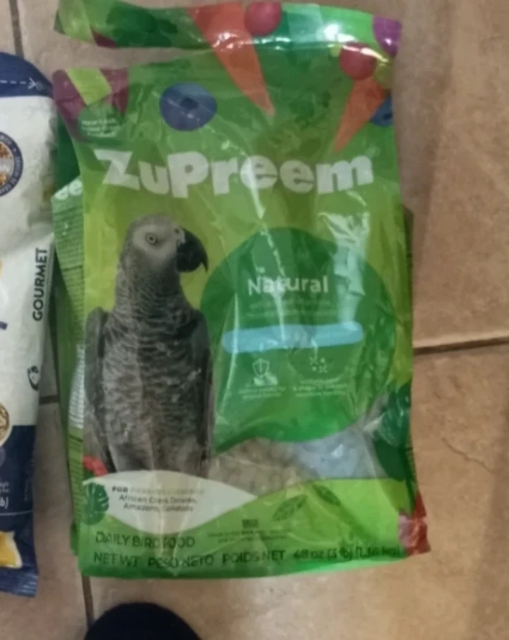 The other is open bag of Zupreem Natural Daily Bird Food for African Cichlids and Amazons, weighing 48 oz (1.36 kg).