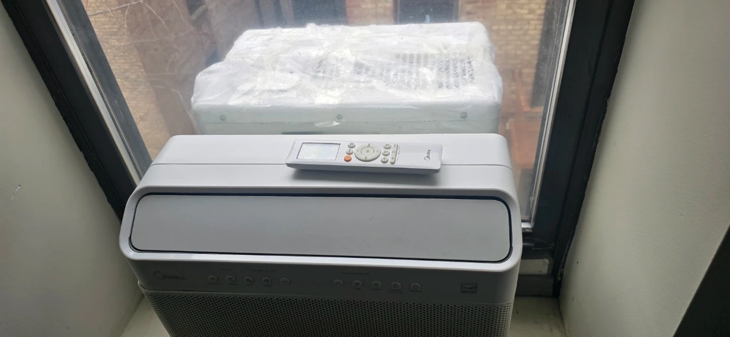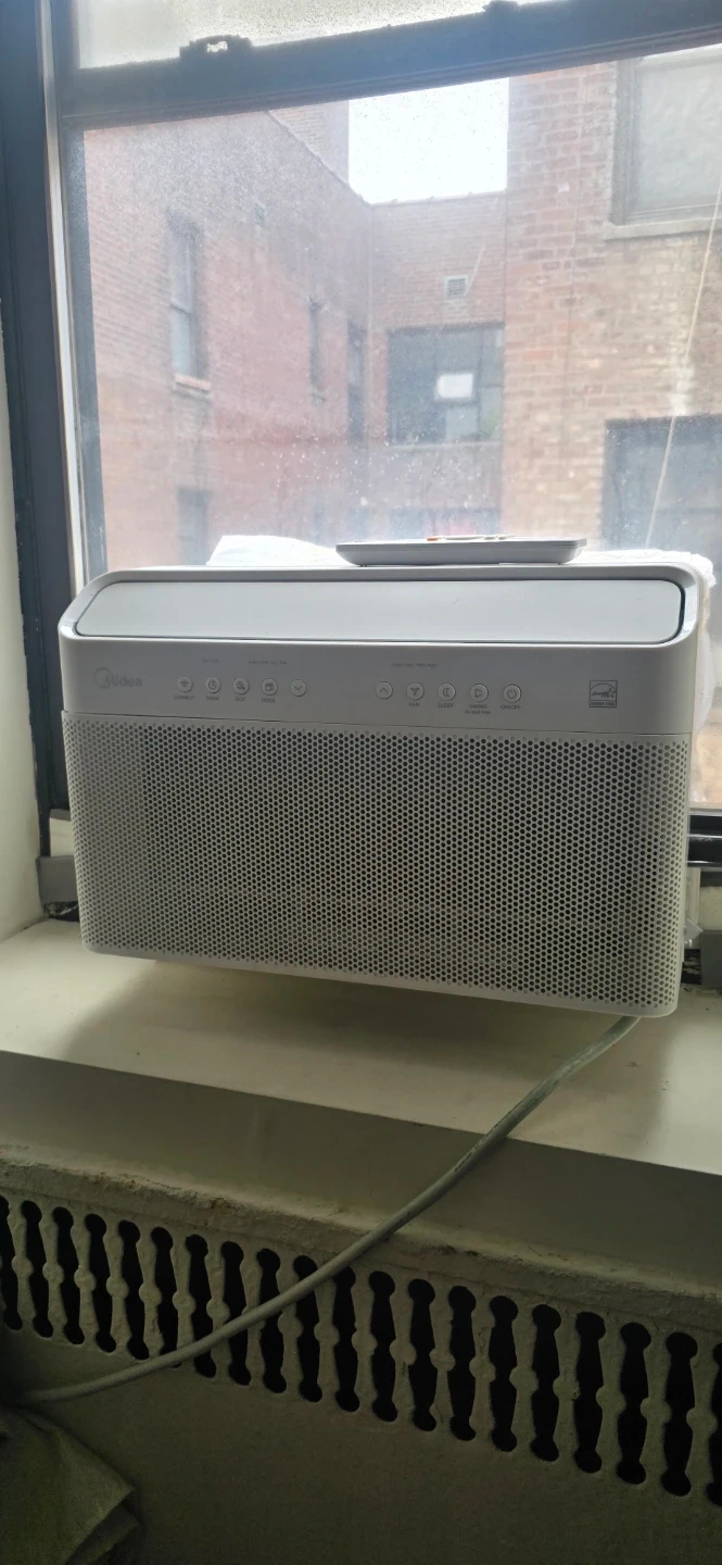 This Midea window air conditioner is in white and comes with a remote control. It's designed for window installation. This unit's dimensions are standard for window ACs. It's in good condition, working well, reason of selling (moving to a new apt)