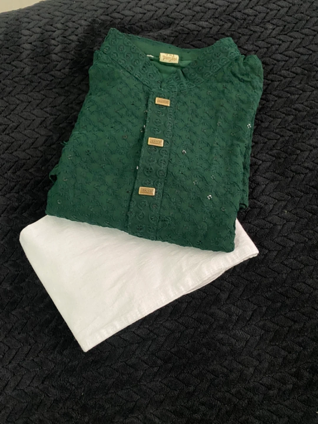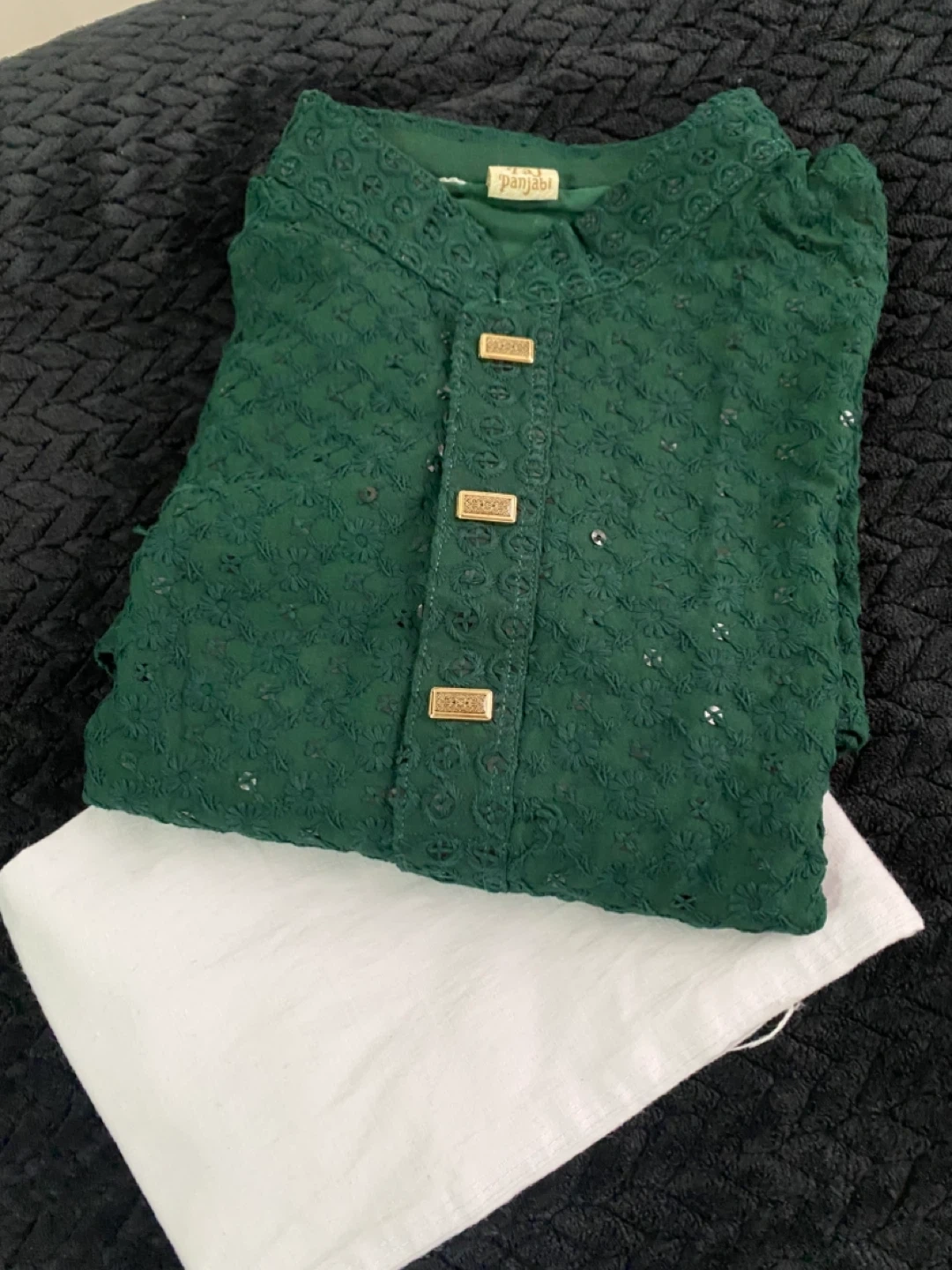 This is a green Panjabi kurta set with white pants. The kurta features intricate embroidery and gold-toned buttons. It's a traditional outfit for cultural events. Pants are included.for 5-6 years