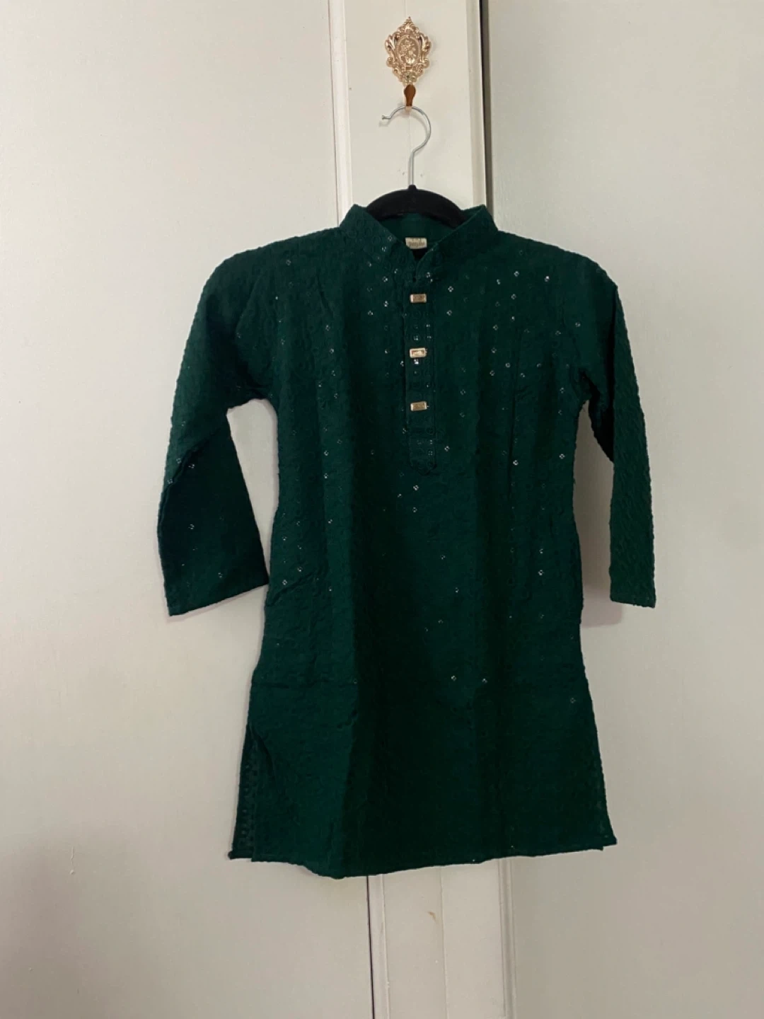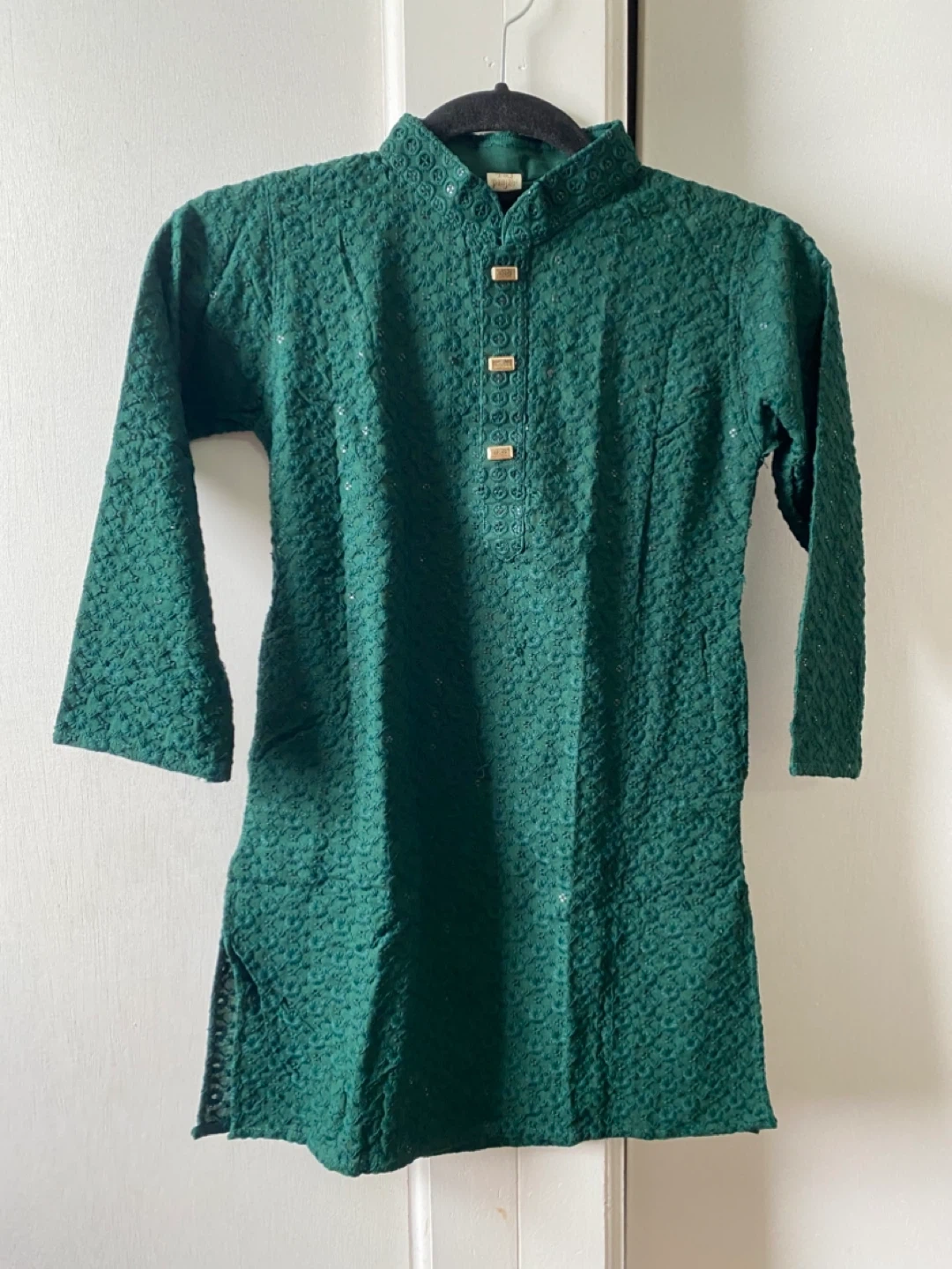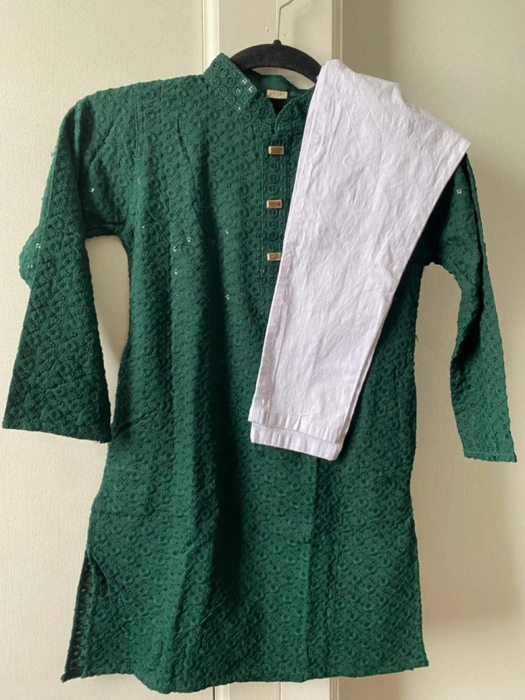 This is a green Panjabi kurta set with white pants. The kurta features intricate embroidery and gold-toned buttons. It's a traditional outfit for cultural events. Pants are included.for 5-6 years