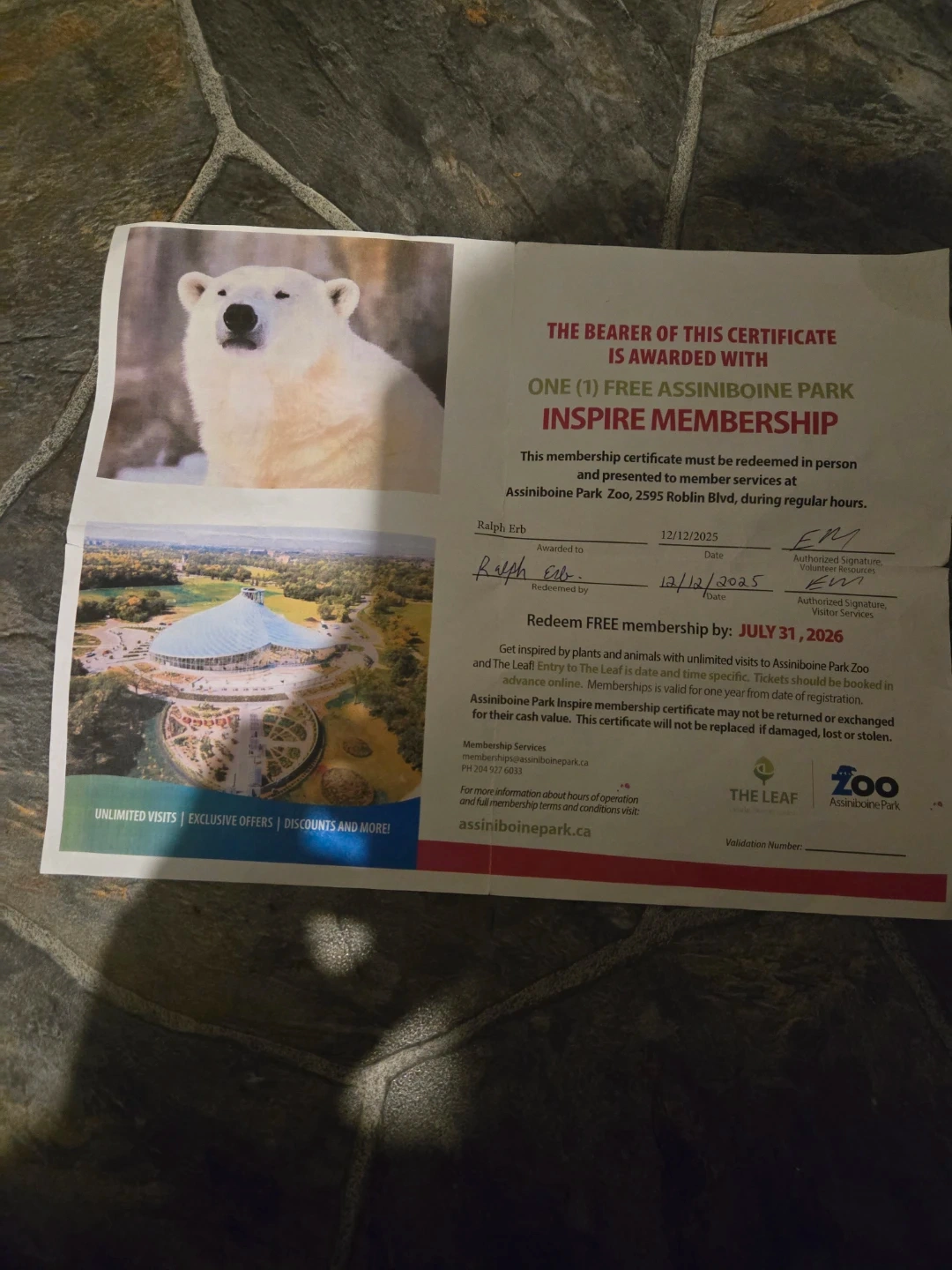 This is a free Assiniboine Park Inspire Membership certificate, awarded with one year of access. It's valid for unlimited visits to Assiniboine Park Zoo and The Leaf. This membership must be redeemed in person and expires July 31, 2026.