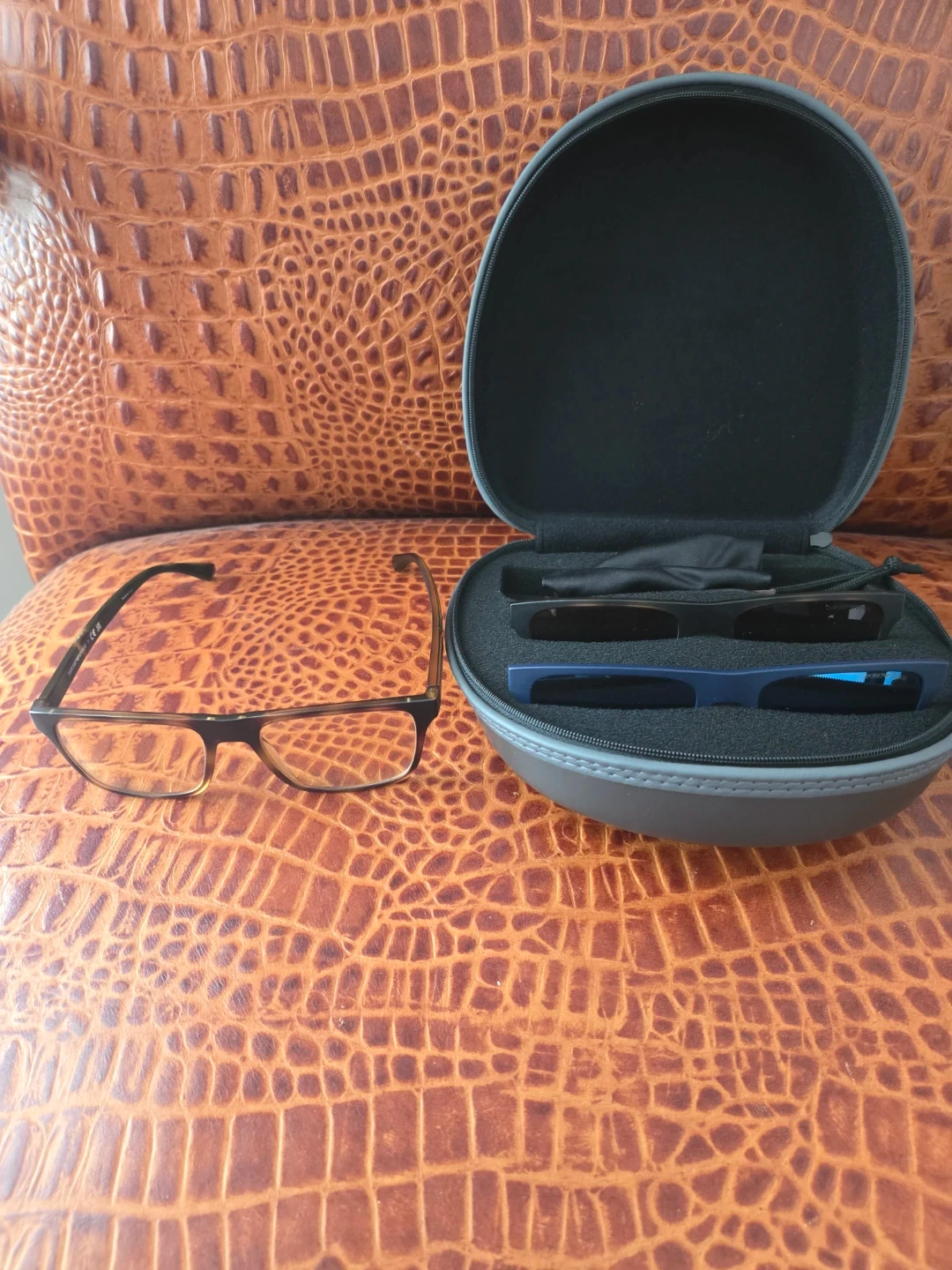 Emporio Armani set featuring sunglasses and prescription glasses. Comes with a protective case and cleaning cloth. Lightweight and durable frames.Two sets of magnetic sunglass lenses.