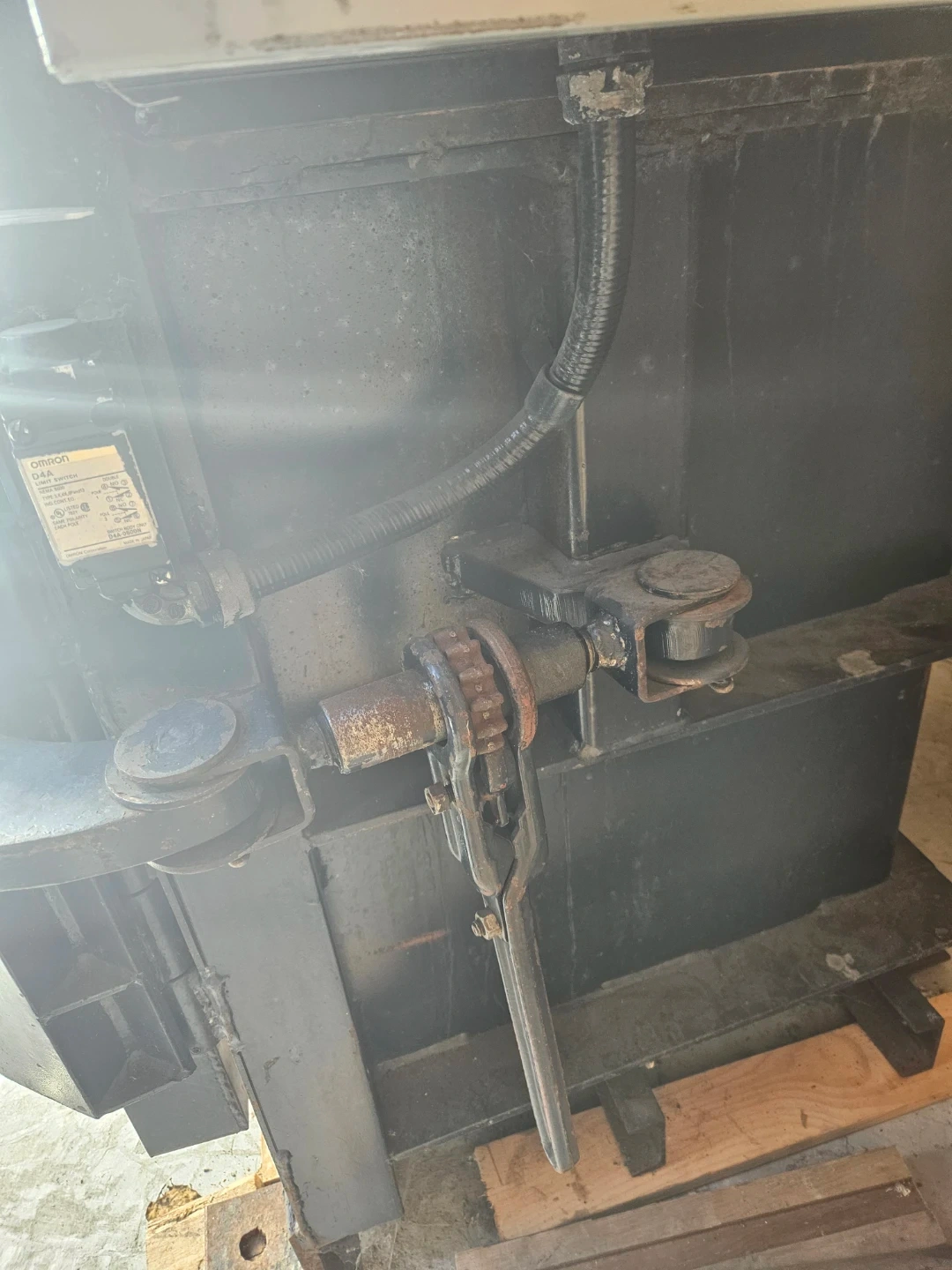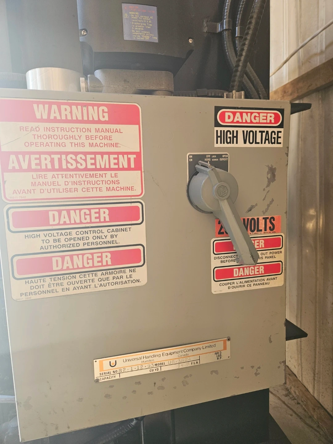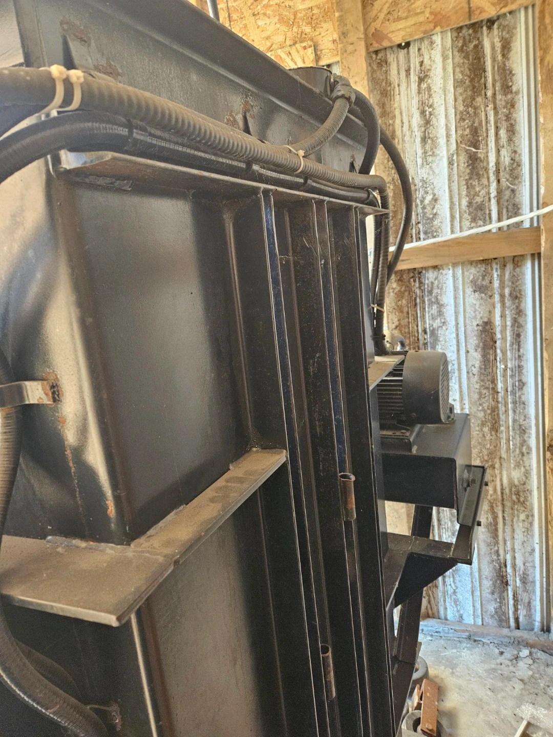 Heavy-duty baler for industrial use. Features a Vevor control panel and Omron limit switch. This equipment is designed for efficient waste management and material compression.