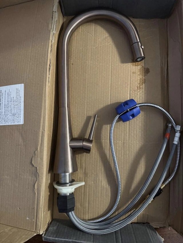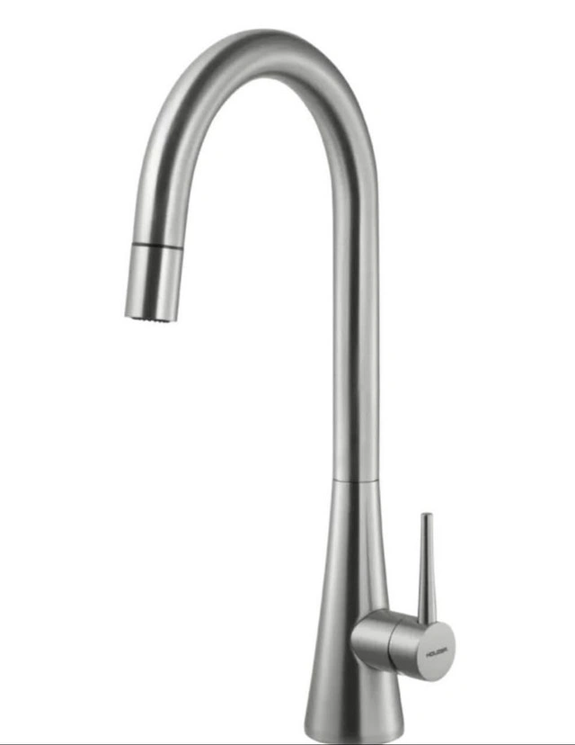 Add elegance and functionality to your kitchen with this Houzer Soma Pull-Down Kitchen Faucet. It combines modern curves with a timeless cone base for a refined look that complements any kitchen style. Features: Solid Brass Construction for durability. Ergonomic Pull-Down Spray with XtendHose that reaches beyond 20 inches for full sink coverage. Easy Maintenance with an AeroFlo removable aerator. Smart Design with 90° forward handle motion to prevent backsplash interference. Includes pull-down spray head. Brand new and unused, this faucet delivers both style and practicality — perfect for any modern kitchen upgrade.