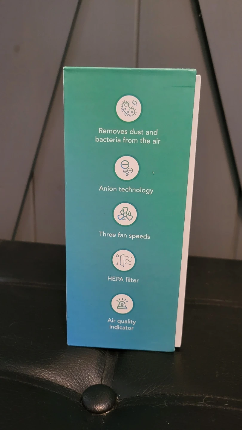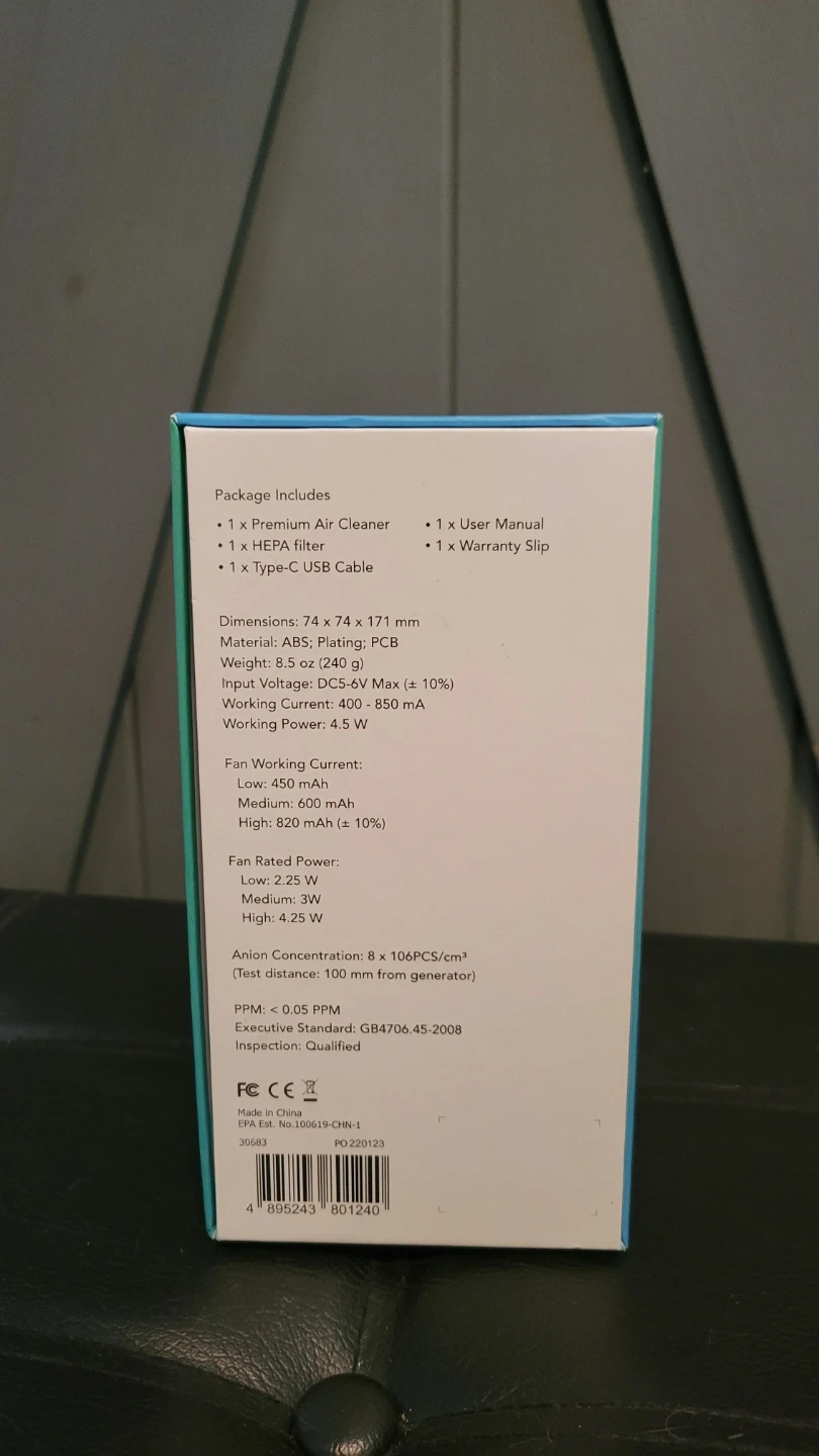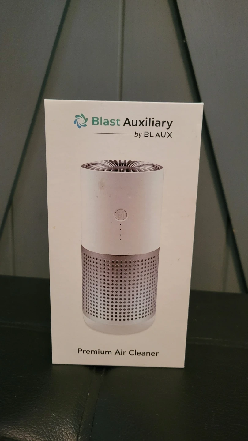 This Blast Auxiliary premium air cleaner uses a HEPA filter to remove dust and bacteria from the air. It features anion technology and three fan speeds with an air quality indicator. Dimensions: 74 x 74 x 171 mm. Includes premium air cleaner, HEPA filter, user manual, and USB cable.